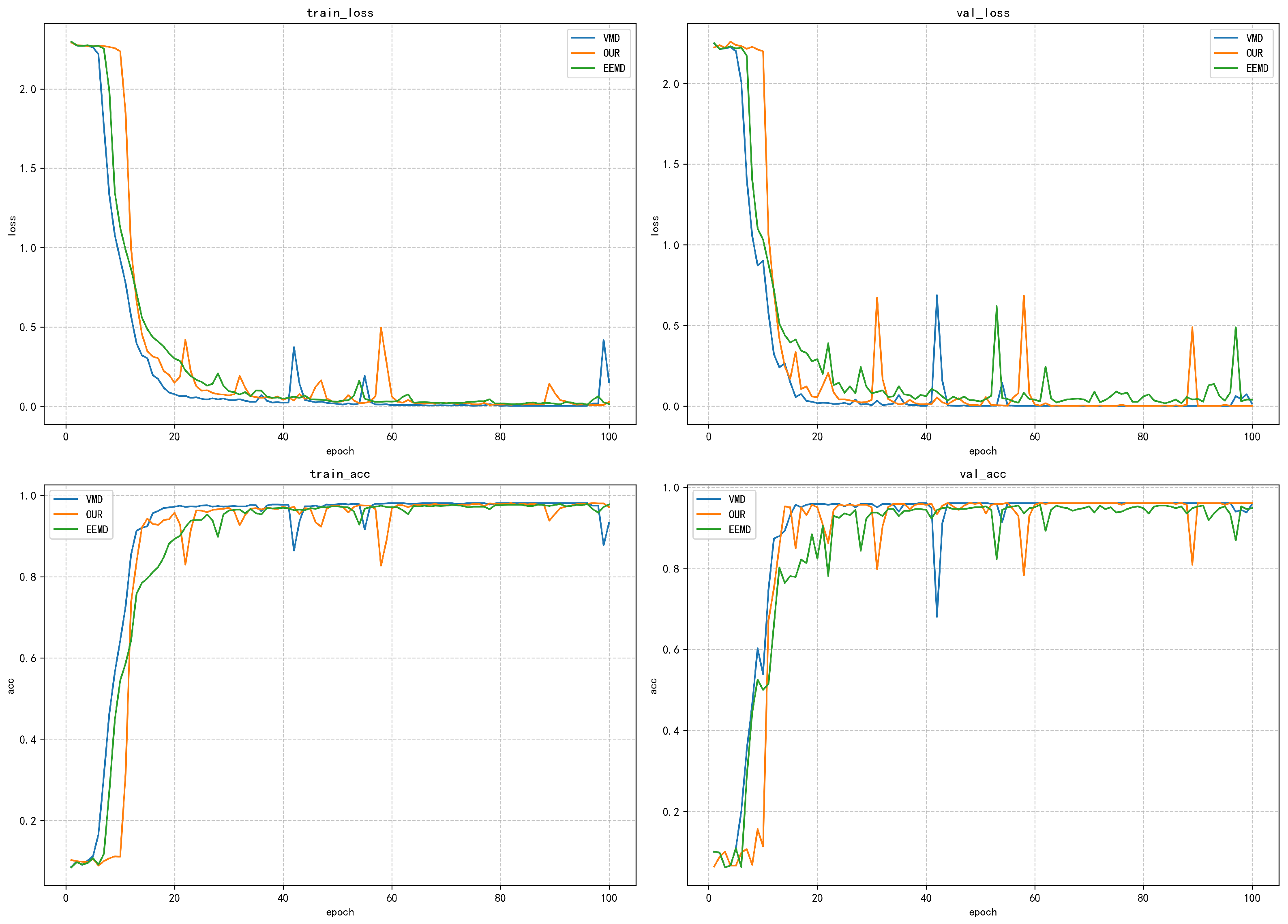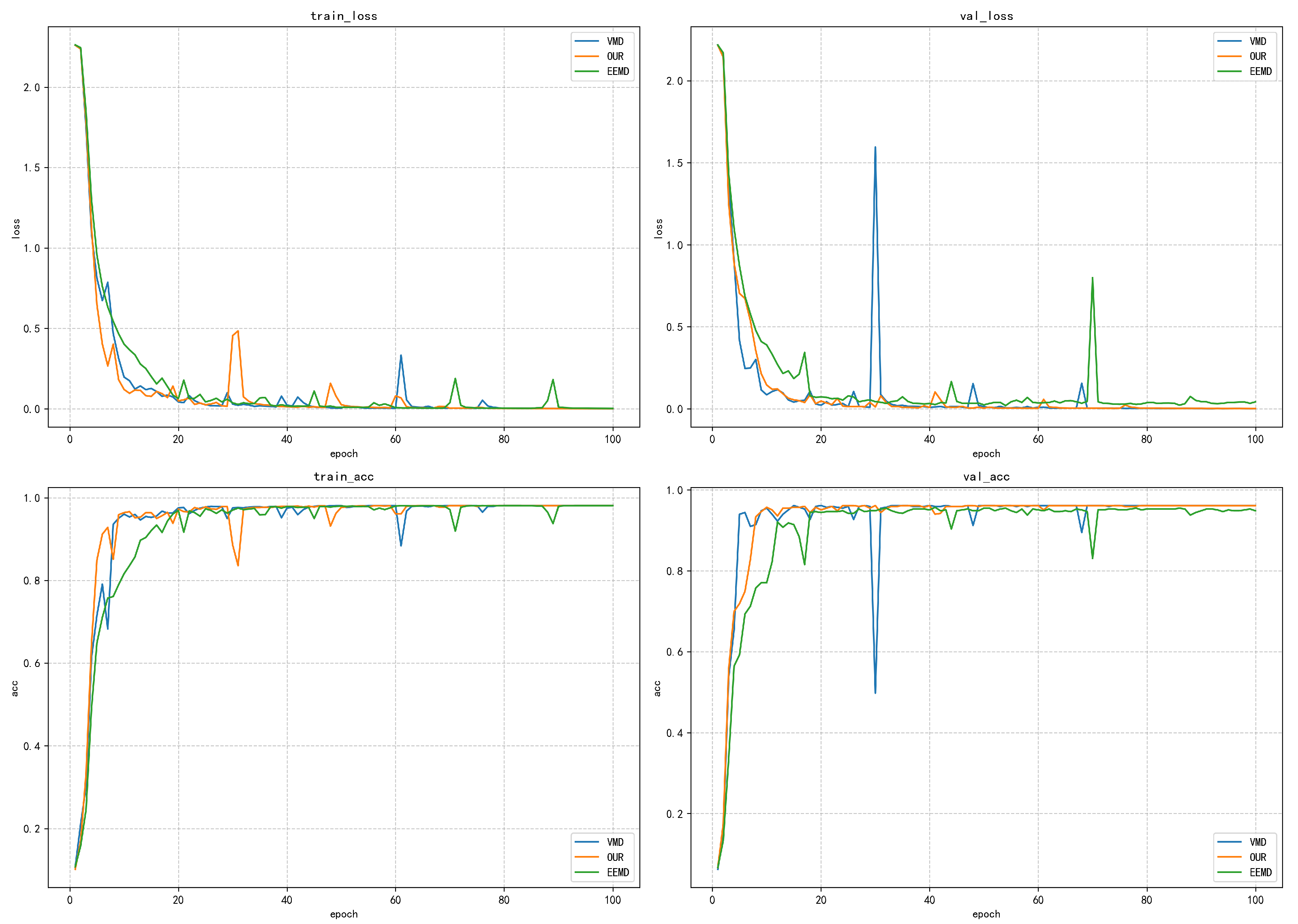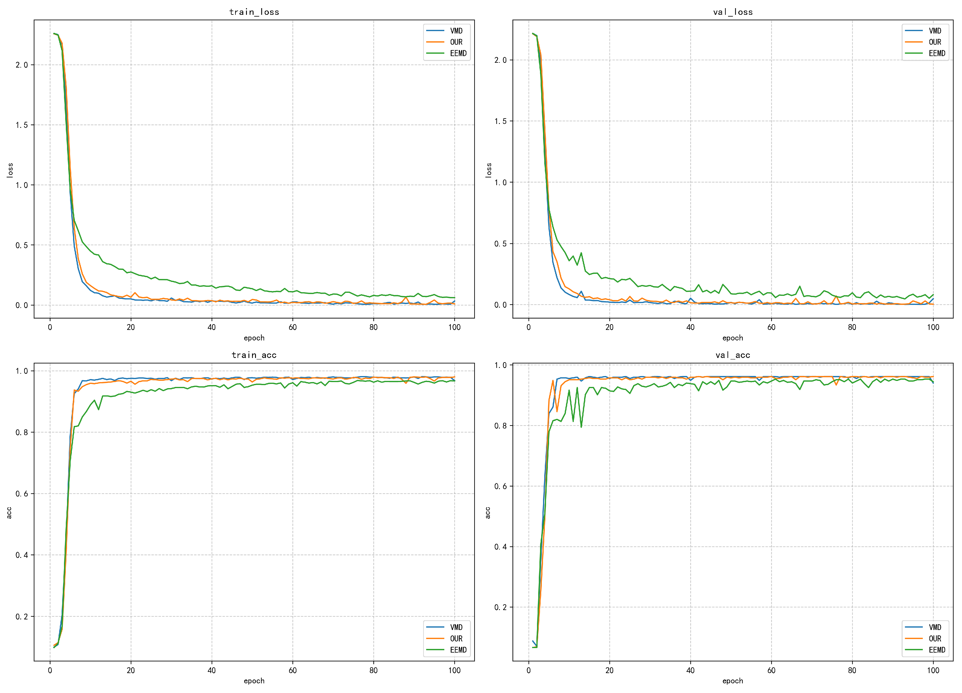 The validation loss curve more significantly reflects the differences between the methods. After 20 iterations, the loss values of the proposed method and VMD have stabilized below 0.5, finally reaching a stable state of approximately 0.25. However, the validation loss of the EEMD method remains above 0.5, and obvious fluctuations occur in the 80–100-iteration interval, indicating that its generalization ability on unseen data is weak. It is noteworthy that the validation loss of all methods is slightly higher than the training loss, but the gap between the proposed method and VMD is controlled within 0.1, demonstrating good generalization ability. In terms of training accuracy, the proposed method and the VMD method show excellent performance: the accuracy exceeds 0.8 within 20 iterations, stabilizes above 0.95 after 40 iterations, and finally approaches the perfect value of 1.0. In contrast, the EEMD method only reaches an accuracy of 0.7 after 60 iterations and finally stabilizes at around 0.8. The validation accuracy curve highlights the differences between the various methods: the proposed method and VMD stabilize above 0.9 after 40 iterations, while the EEMD method only reaches approximately 0.7 in the end, with obvious fluctuations.