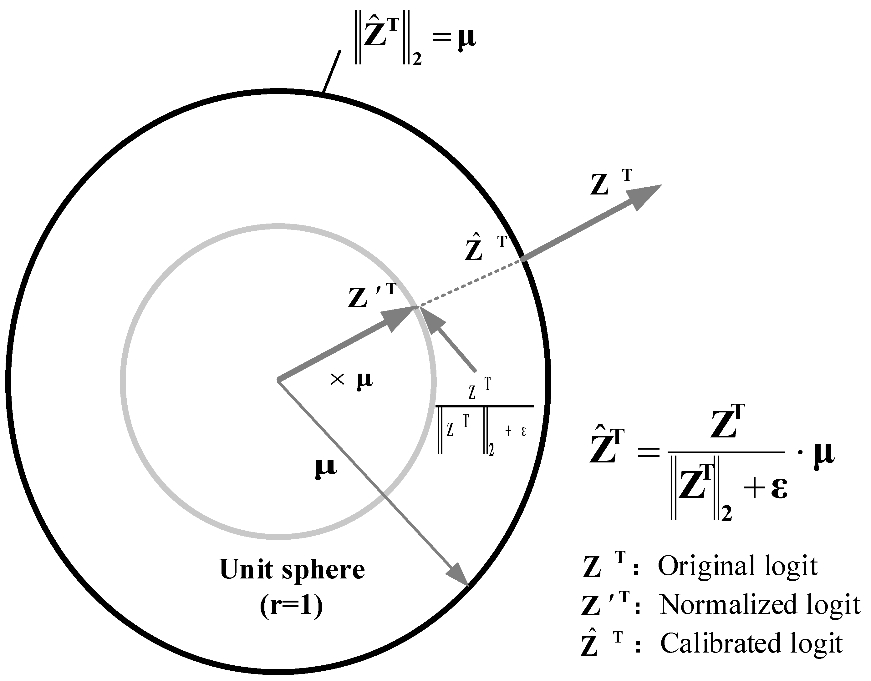 Visualization of scale calibration: projecting teacher logits onto a hypersphere via L2 normalization and rescaling.