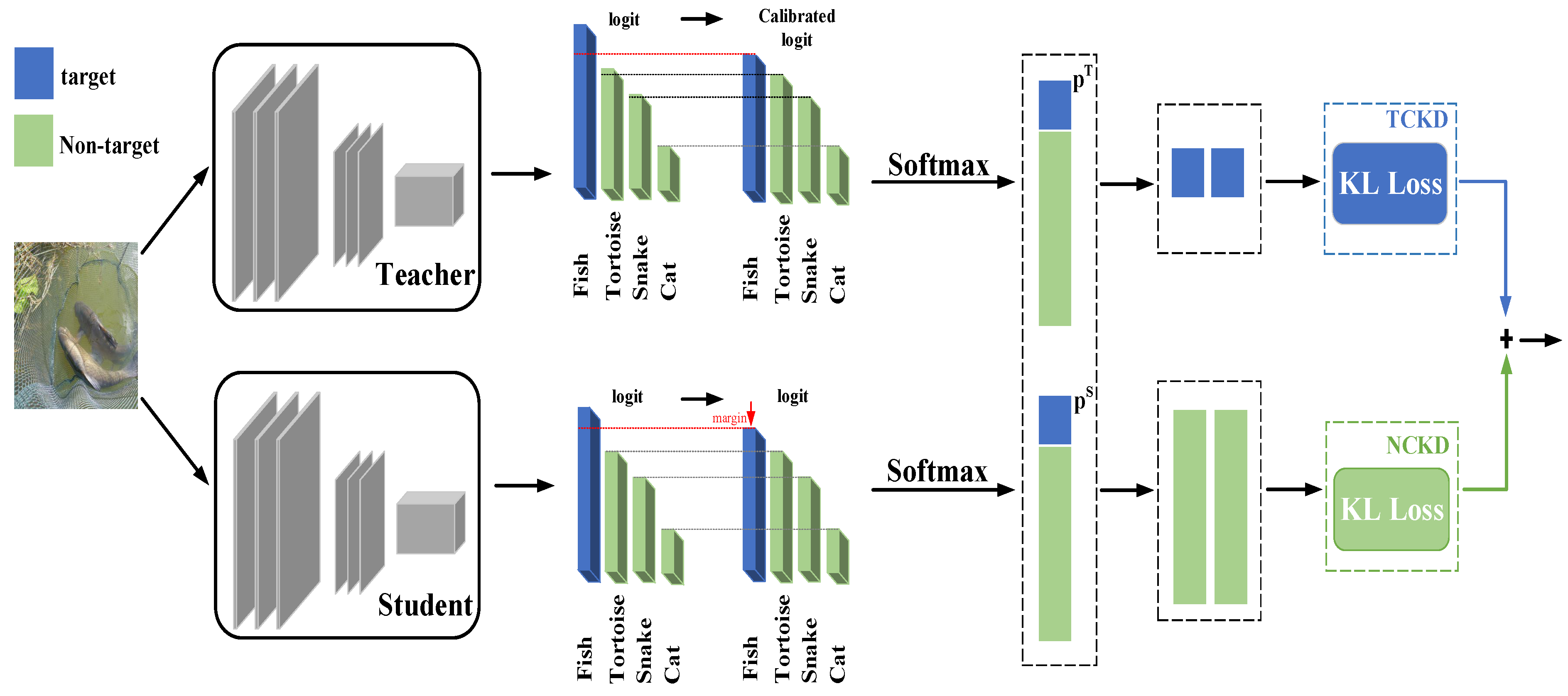 SPKD calibrates teacher logits via L2 normalization and rescaling to a stable magnitude, applies margin-based pressure to student logits, then decouples distillation into TCKD (target class) and NCKD (non-target classes).