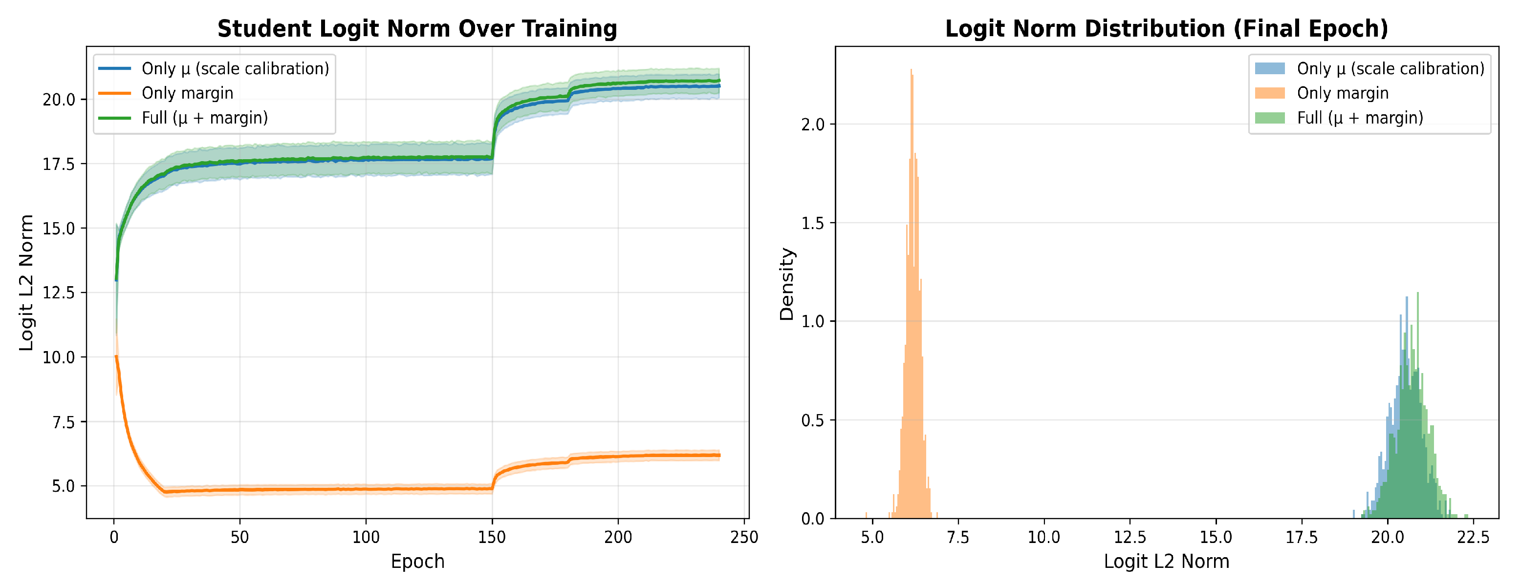 Student logit L2 norm distribution under different gradient modulation strategies.