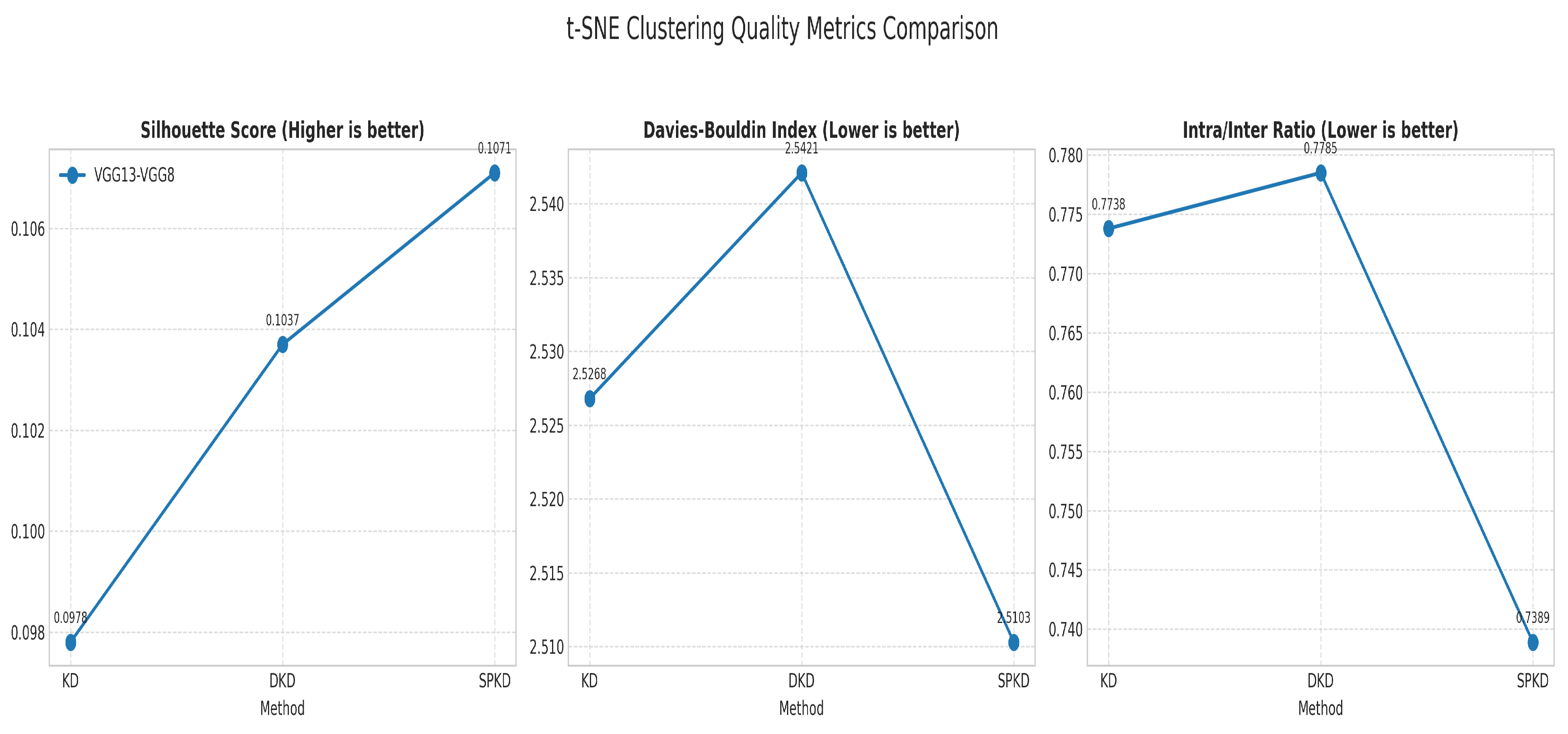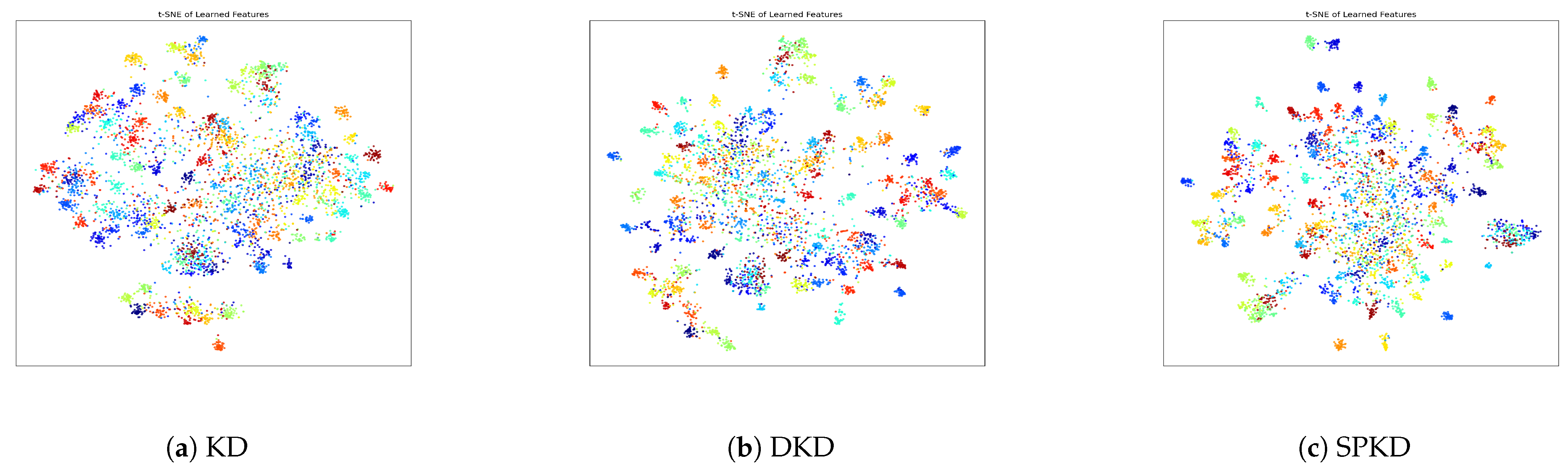 Comparison of t-SNE plots of learned features under different methods. (a) Feature distribution learned using the classical KD method. (b) Feature distribution learned using the DKD method. (c) Feature distribution learned using our proposed SPKD method, showing better-defined clusters.