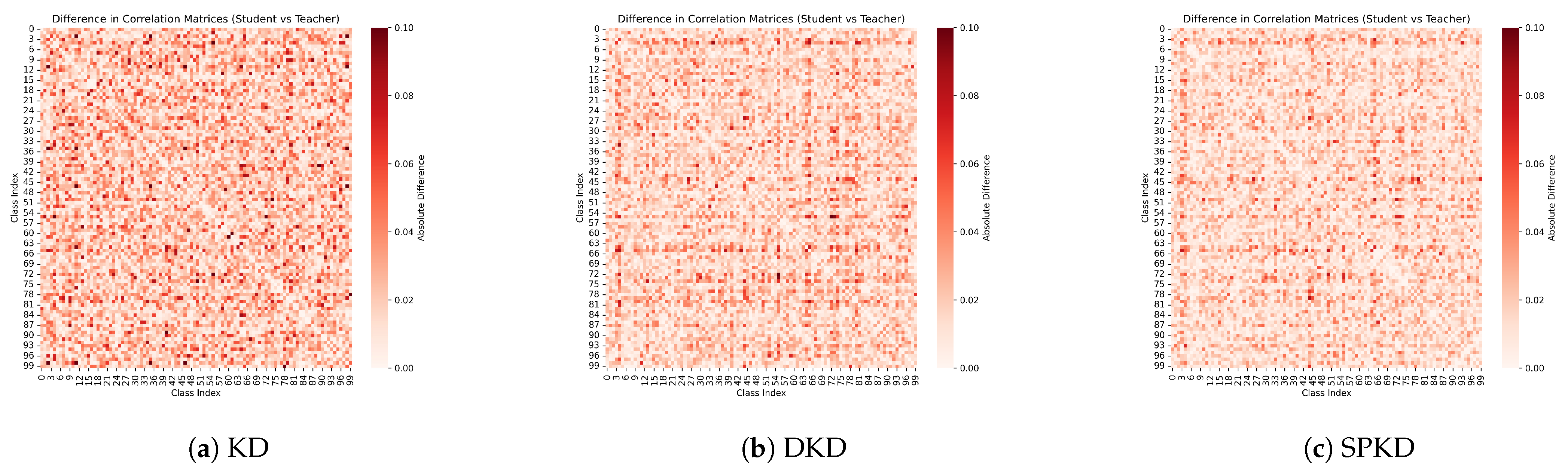 Differences in student and teacher logit correlation matrices. (a) The difference matrix under the KD method. (b) The difference matrix under the DKD method, showing smaller differences than KD. (c) The difference matrix under our SPKD method, which achieves the smallest differences among the three.
