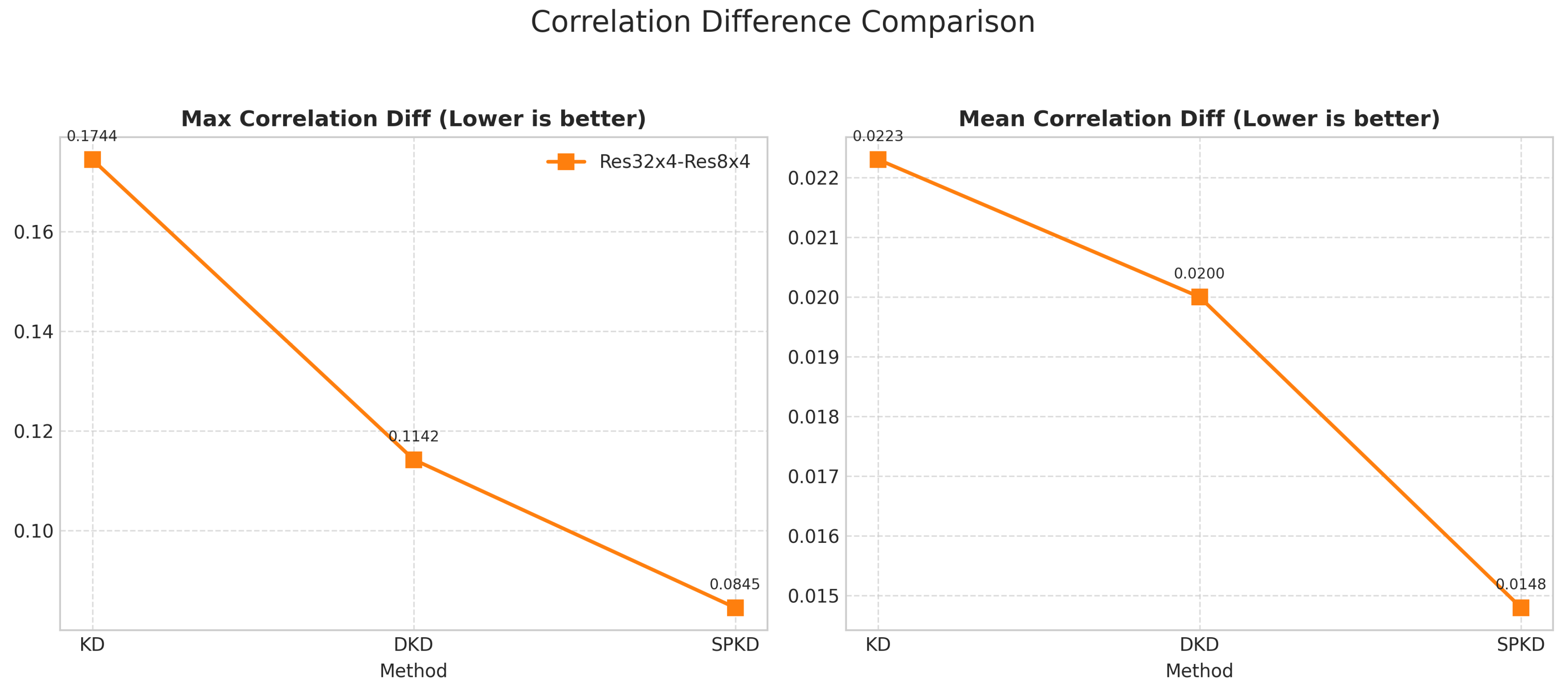 Teacher–student logit-alignment quantified by correlation–difference metrics.