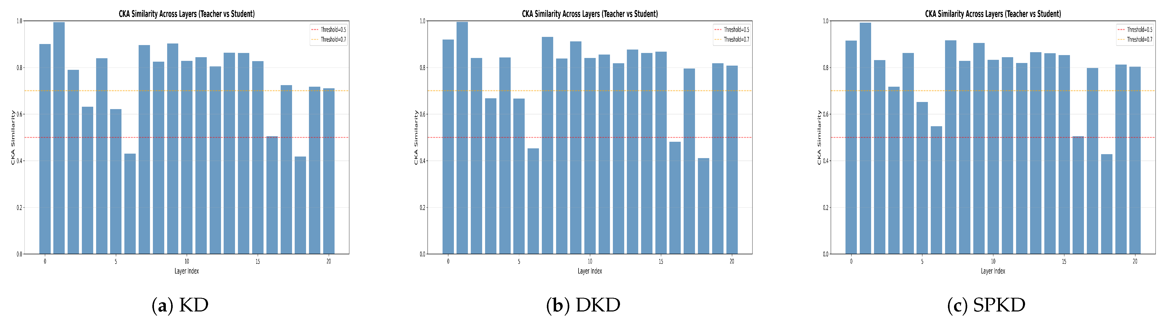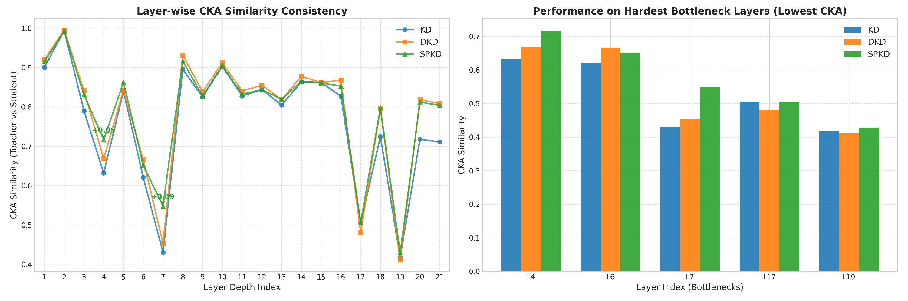 Teacher–student alignment quantified by CKA-based similarity metrics.
