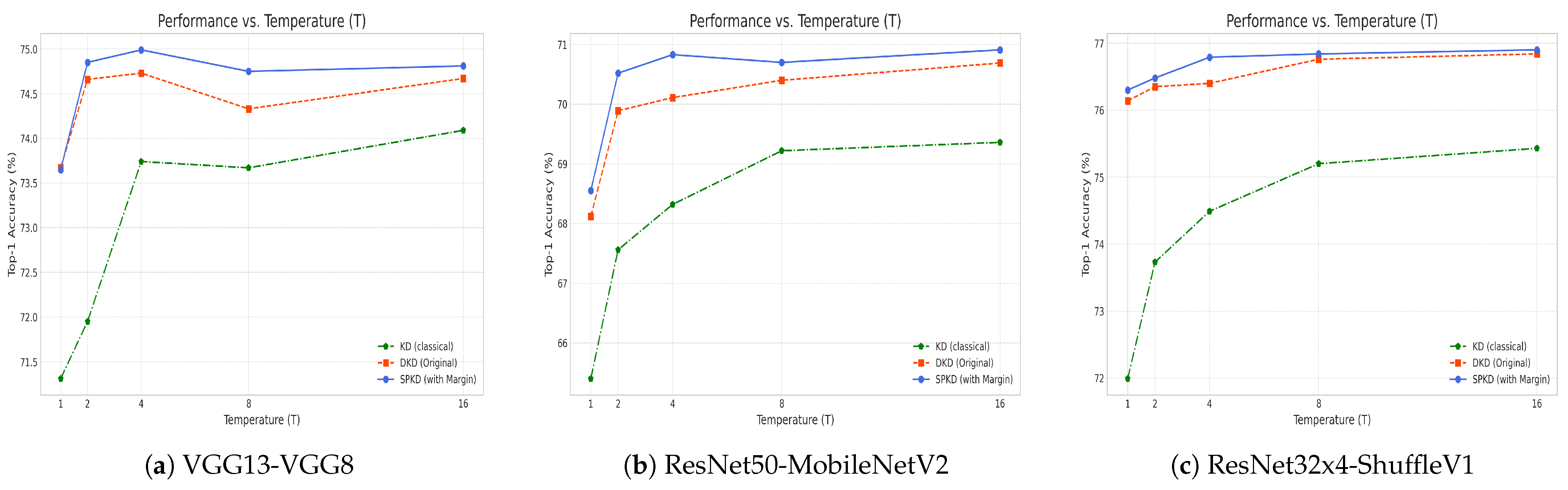 | Teacher–Student Pairs | Temperature (T) | KD | DKD | SPKD |