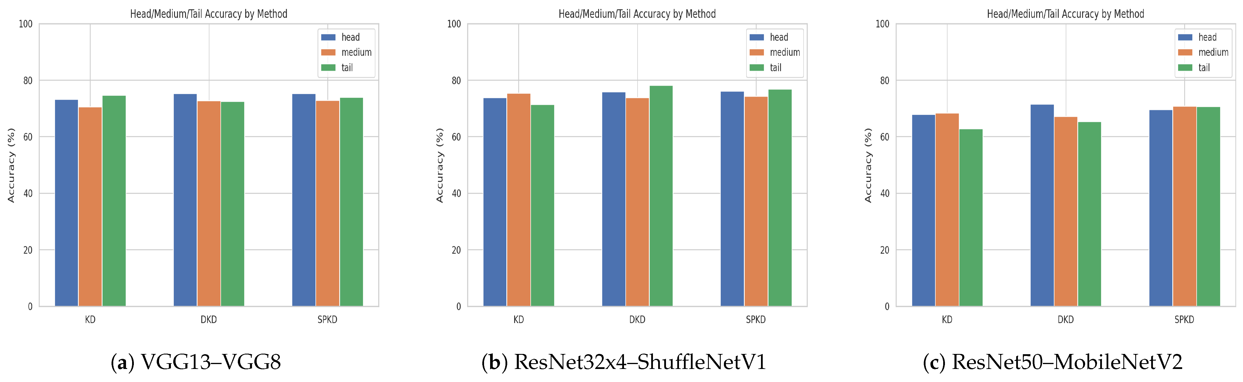 Comparison of Top-1 accuracy across Head, Medium, and Tail subgroups to evaluate generalization on imbalanced data. (a) VGG13–VGG8 pair. (b) ResNet32x4–ShuffleV1 pair. (c) ResNet50–MobileNetV2 pair.