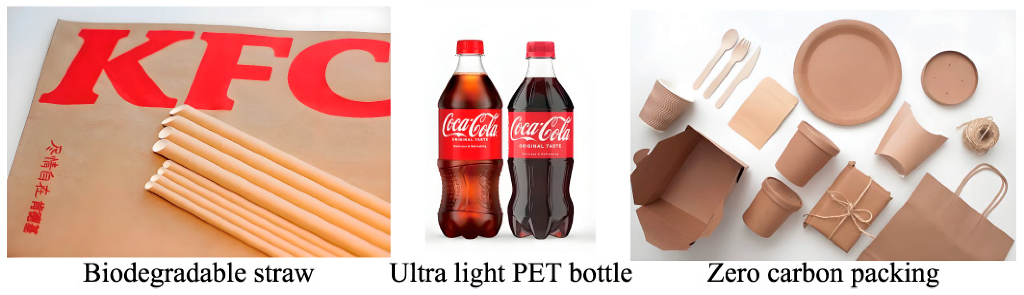 5]. Numerous green and sustainable packaging solutions have been developed and applied in commercial products. For example, Coca-Cola uses lightweight PET bottles to reduce packaging material consumption and processing energy consumption; KFC’s biodegradable straws ensure no environmental burden after disposal; and zero-carbon packaging minimizes material usage while prioritizing the recyclability of materials (