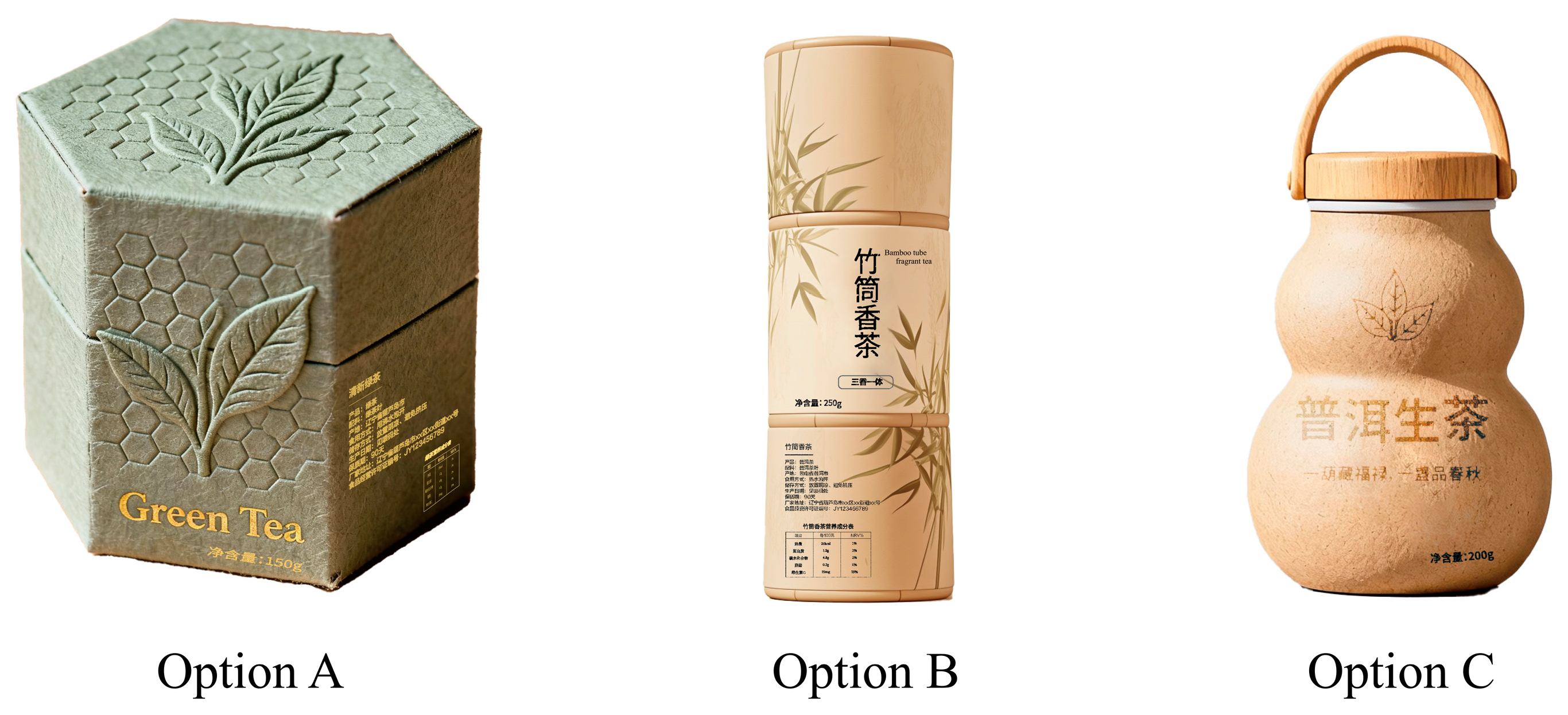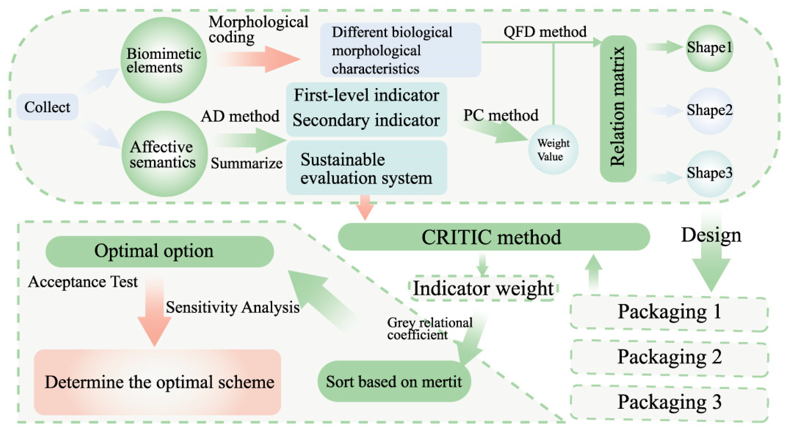 To address the deficiencies of existing packaging research in form and user affective semantics, this study aims to: (i) systematically collect natural forms suitable for biomimetic packaging design, integrate affective semantics and sustainability evaluation indicators for packaging, and establish a “natural form-affective semantics” mapping matrix; (ii) conduct conceptual practice based on this mapping to develop three biomimetic-form tea packaging conceptual designs; (iii) construct a sustainable multi-criteria evaluation framework to determine indicator weights and conduct comprehensive evaluations of design schemes, identify the optimal solution, and refine design strategies.