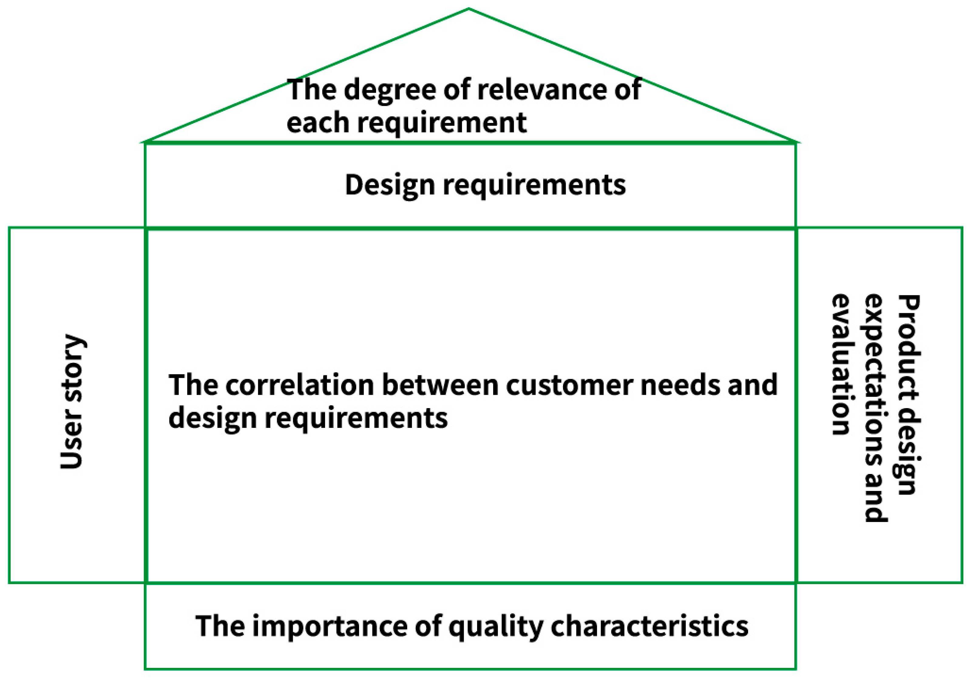 30]. The core of QFD is the House of Quality (HOQ), a matrix framework that intuitively transforms needs during product design. Its structure includes: Left Wall (user needs), Ceiling (design requirements), Roof (correlation between requirements), House (correlation between customer needs and design requirements), Floor (importance of quality characteristics), and Right Wall (product design expectations and evaluations) (