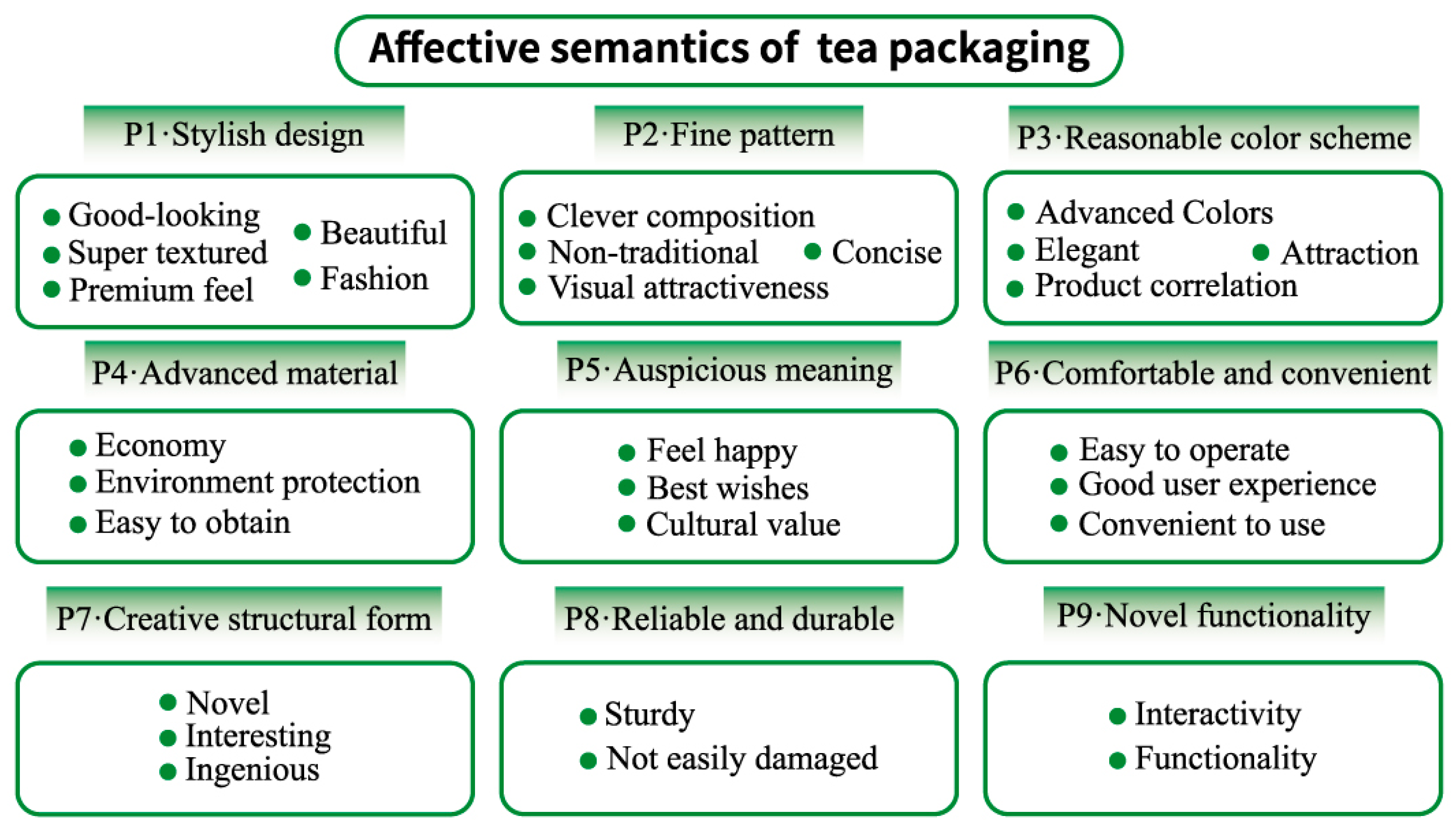 (2) Systematically gather affective semantics descriptions and keywords regarding the functionality, emotion, and design of 9 biomimetic tea packaging schemes through open-ended questionnaires, in-depth interviews, or focus groups. To enhance data credibility, this study will adopt triangulation and observation notes to ensure the comprehensiveness and consistency of the collected opinions.