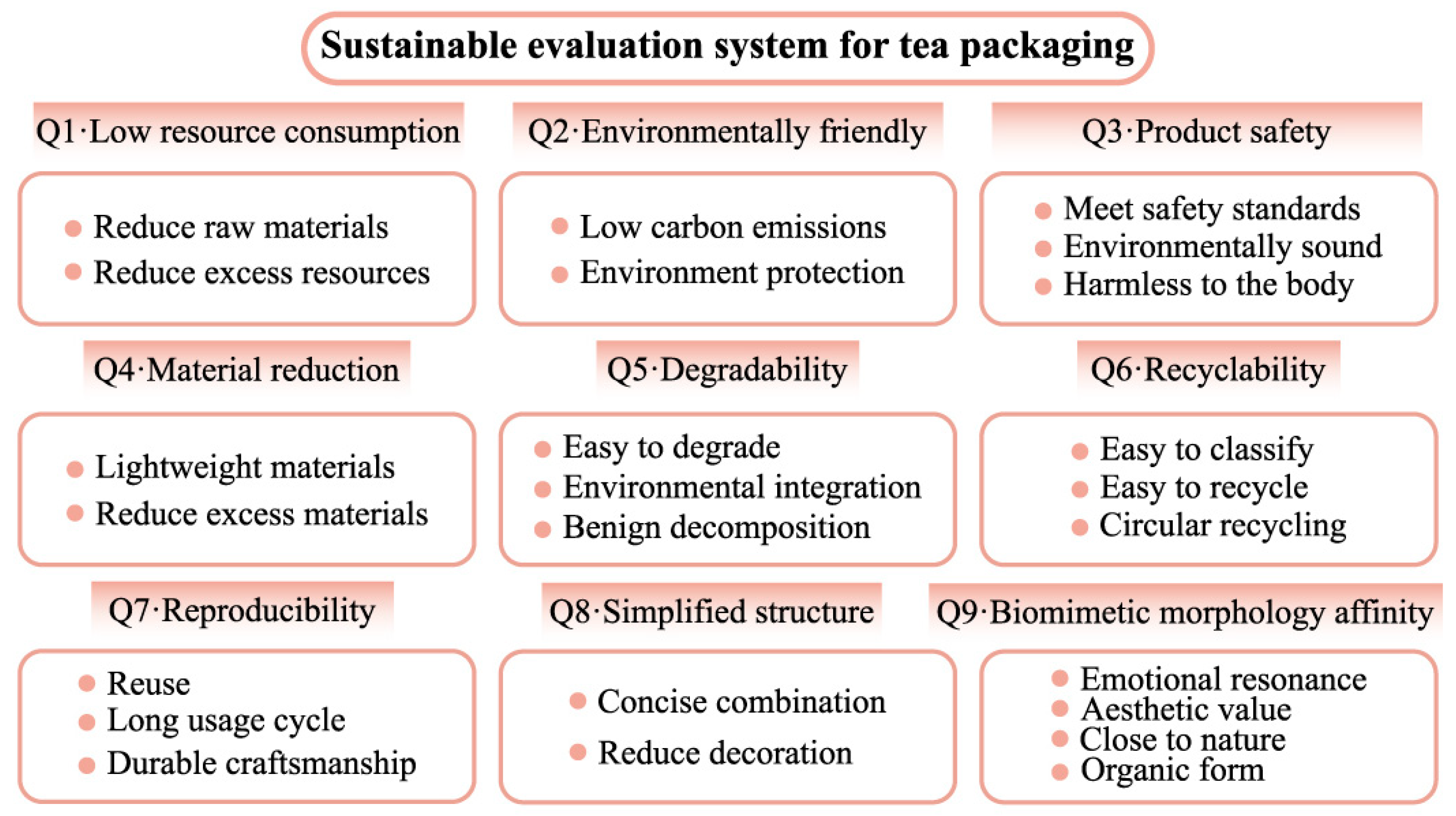 Simultaneously, 24 sustainability evaluation indicators were collected from interviews, and 9 core sustainability evaluation indicators for biomimetic tea packaging were generated: Low Resource Consumption (Q1), Environmentally Friendly (Q2), Product Safety (Q3), Material Reduction (Q4), Degradability (Q5), Recyclability (Q6), Reproducibility (Q7), Simplified Structure (Q8), and Biomimetic Morphology Affinity (Q9). They are consistent with the mainstream evaluation framework for green packaging design, with no redundancy among indicators, and can effectively reflect the core dimensions of packaging sustainability (
