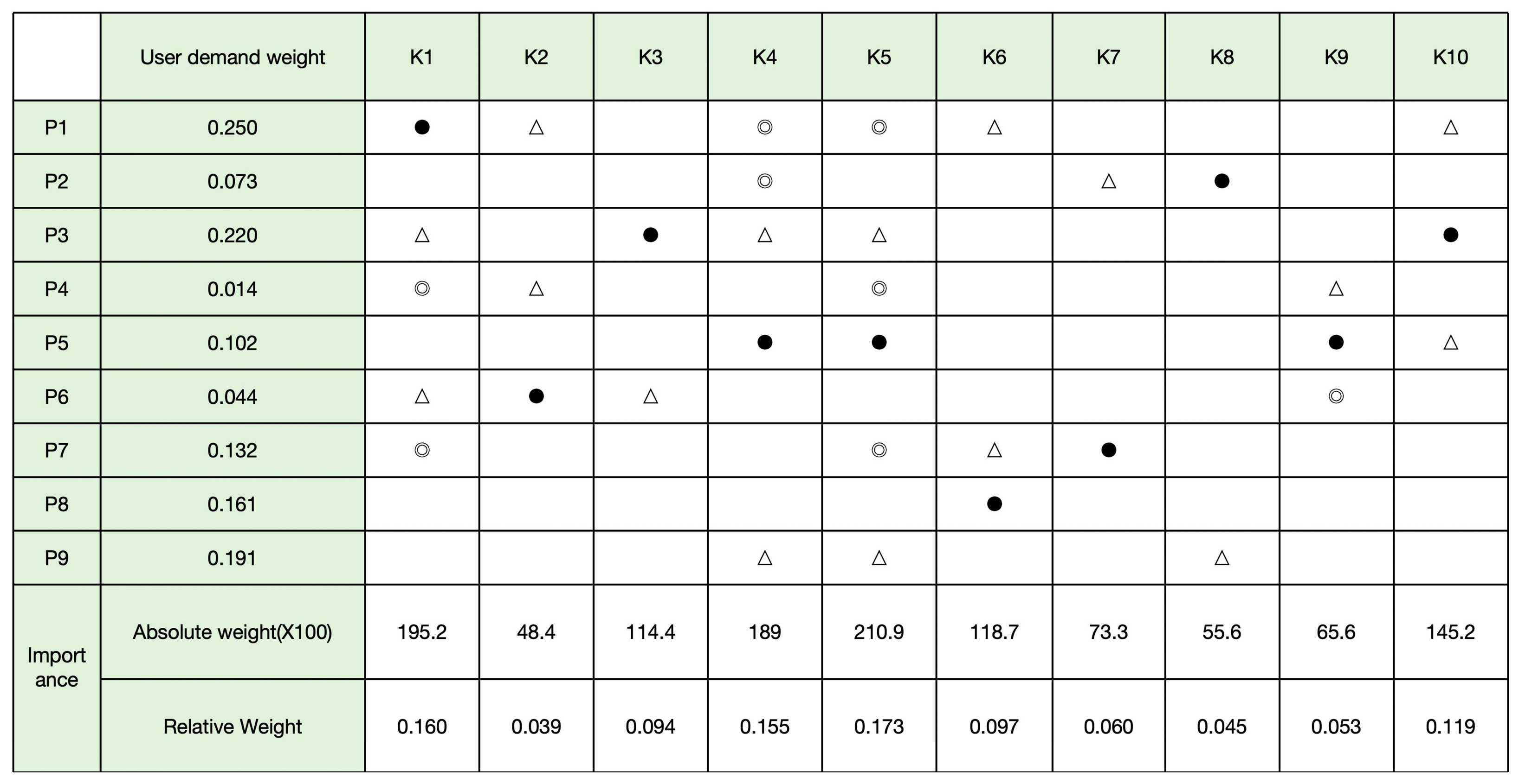 (2) Quantify the correlation between user needs and biomimetic elements to form the House of the HOQ.
