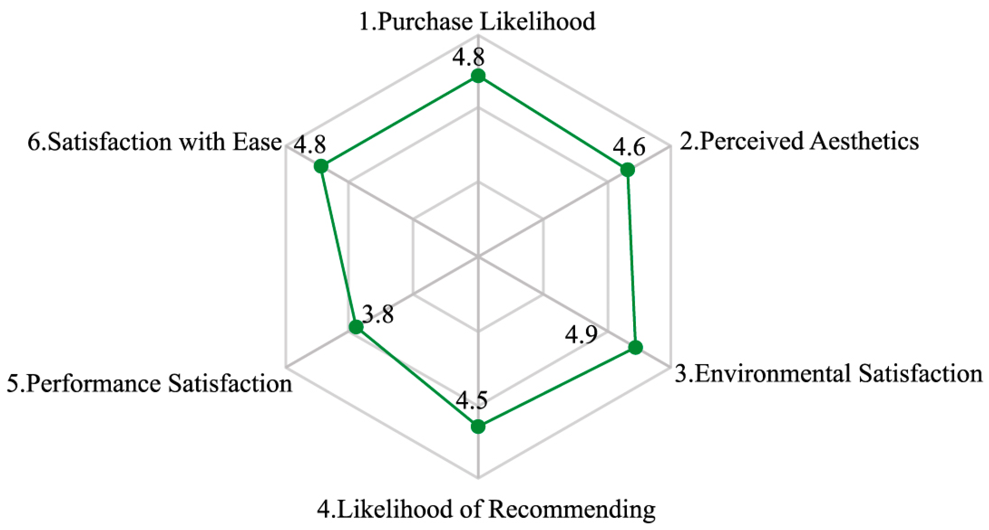 Descriptive statistical analysis shows that most consumers approve of this design scheme and are willing to recommend it. As this design focuses primarily on packaging form, its bamboo joint-inspired biomimetic structure adopts a flip-top design, which tends to cause poor sealing performance. Thus, the environmental attribute received the highest score, while performance satisfaction was slightly lower than that of other dimensions.