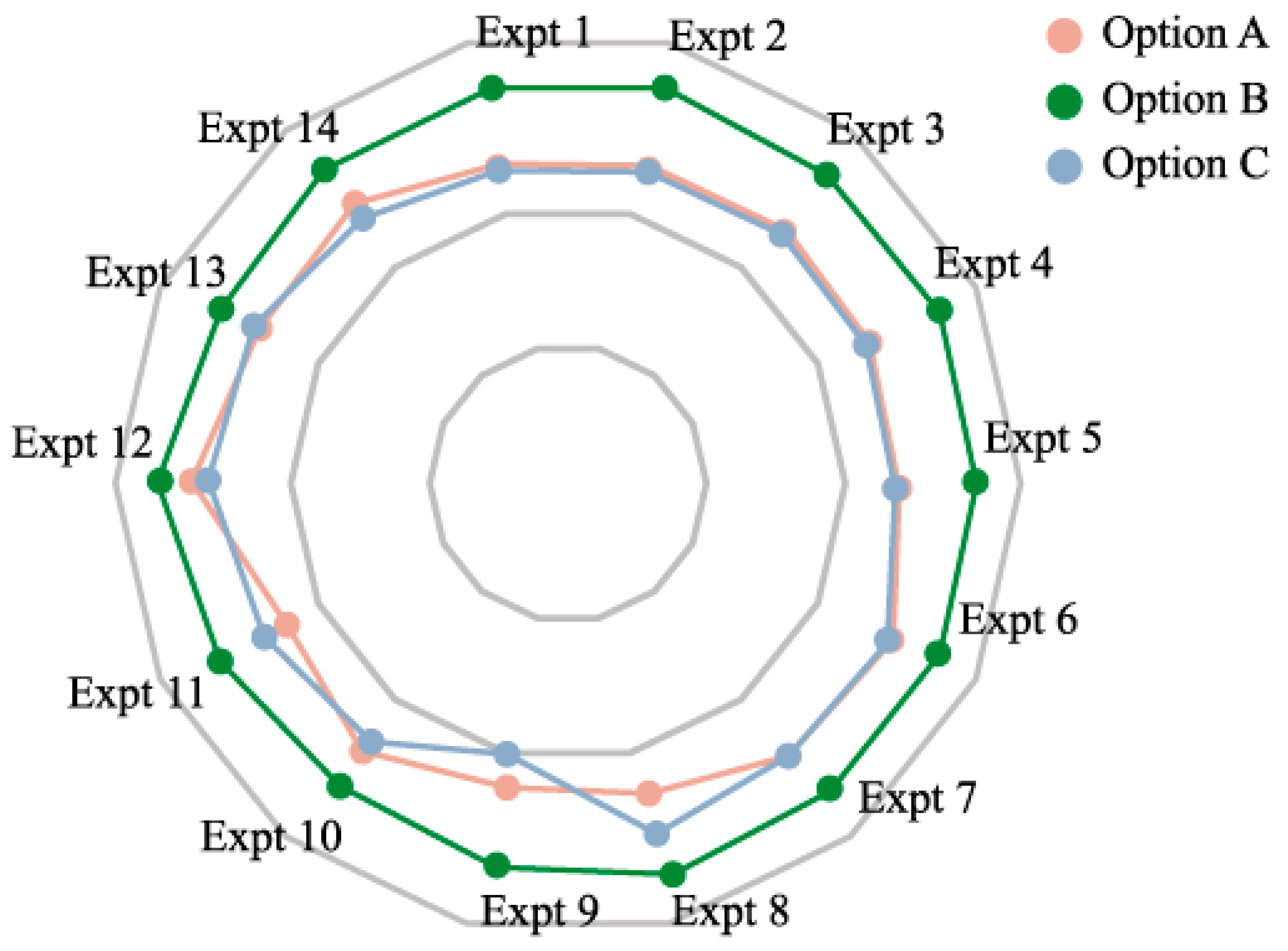 Based on the results of the 14 experiments, Packaging option B consistently achieved the highest grey relational degree under different weight configurations, confirming that option B is the robust optimal choice across diverse weight scenarios (