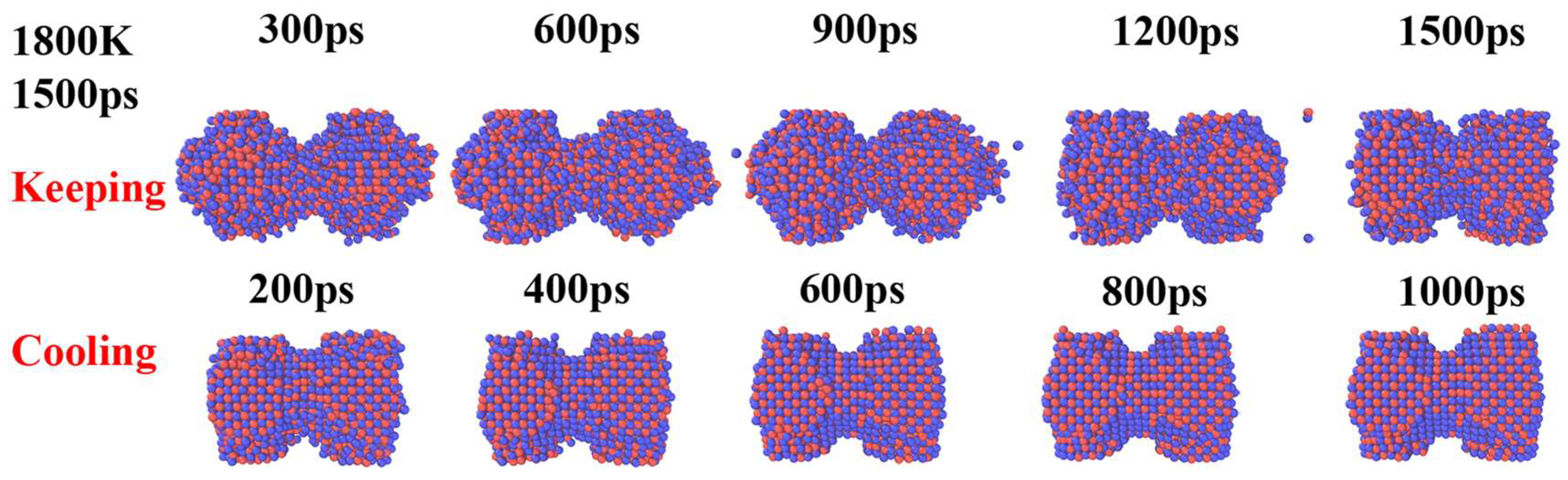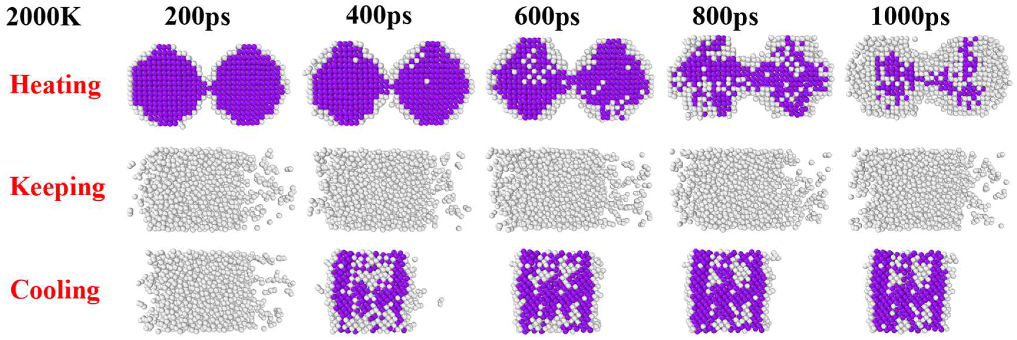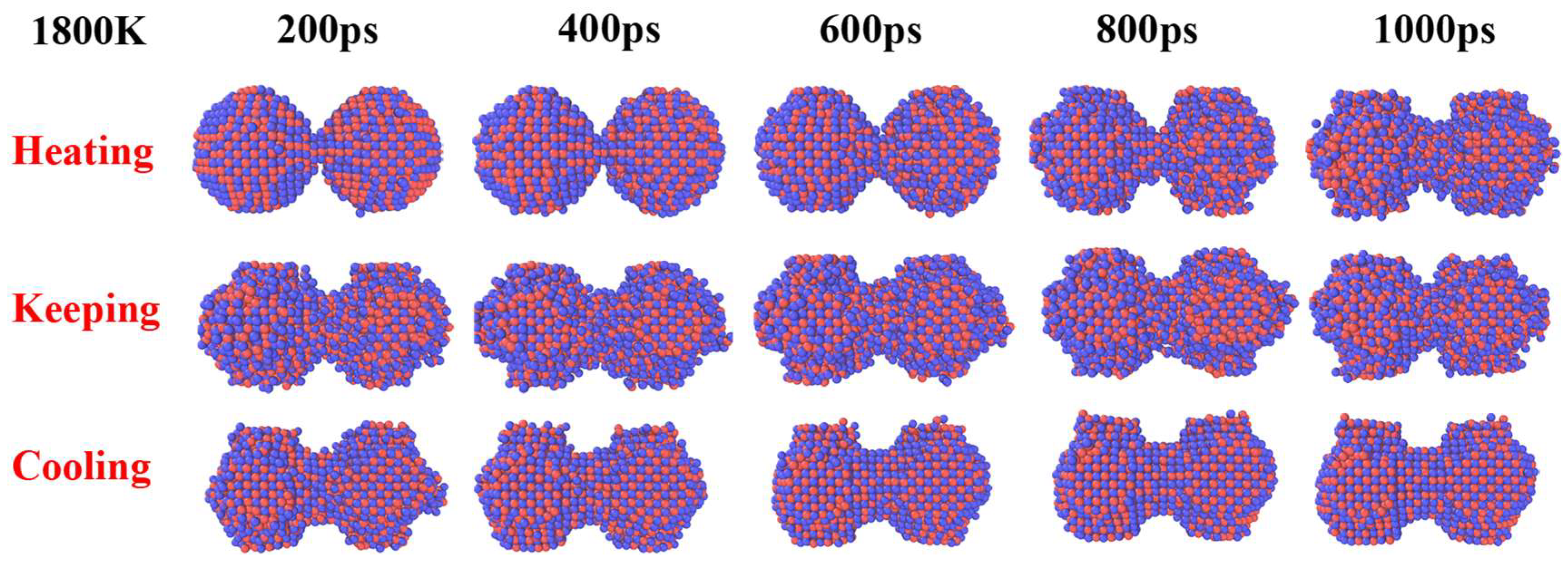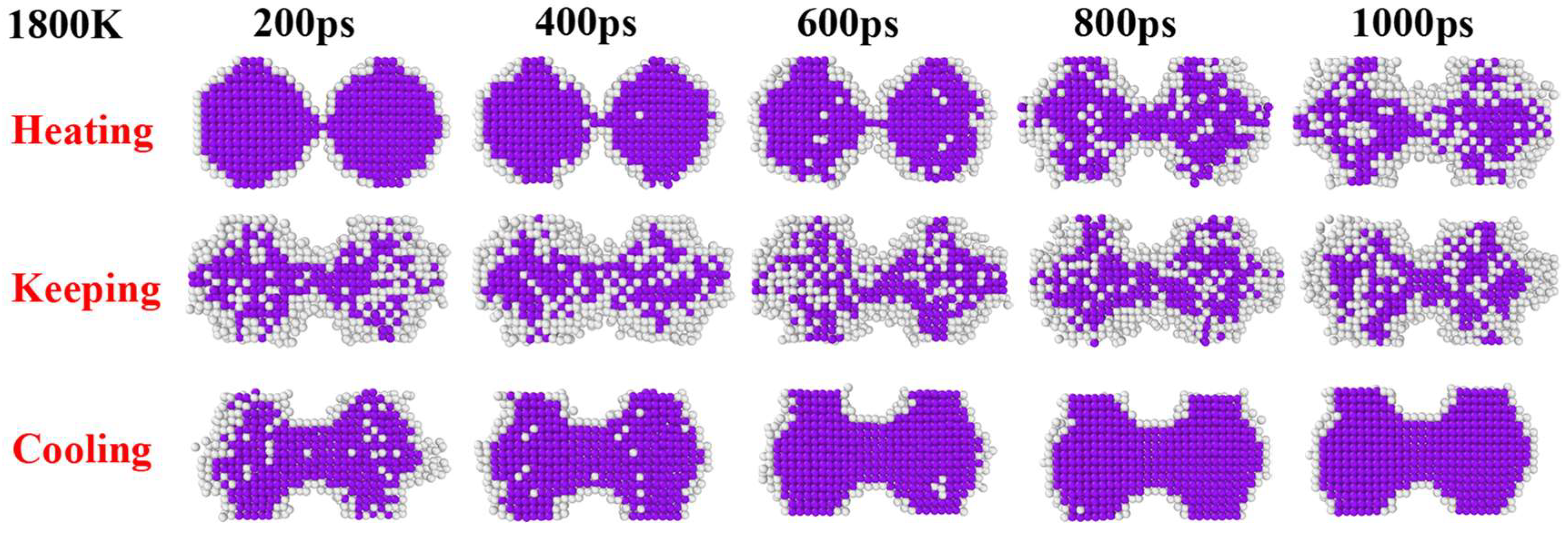 - Wang, Z.; Song, Z.; Luo, W.; Shang, T.; Liu, Z.; Yuan, J.; Fan, X.; Zhu, Y. The effect of temperature on the mechanisms of Cu nanoparticle sintering: A molecular dynamic study. Powder Technol. 2024, 440, 119802. [Google Scholar] [CrossRef]