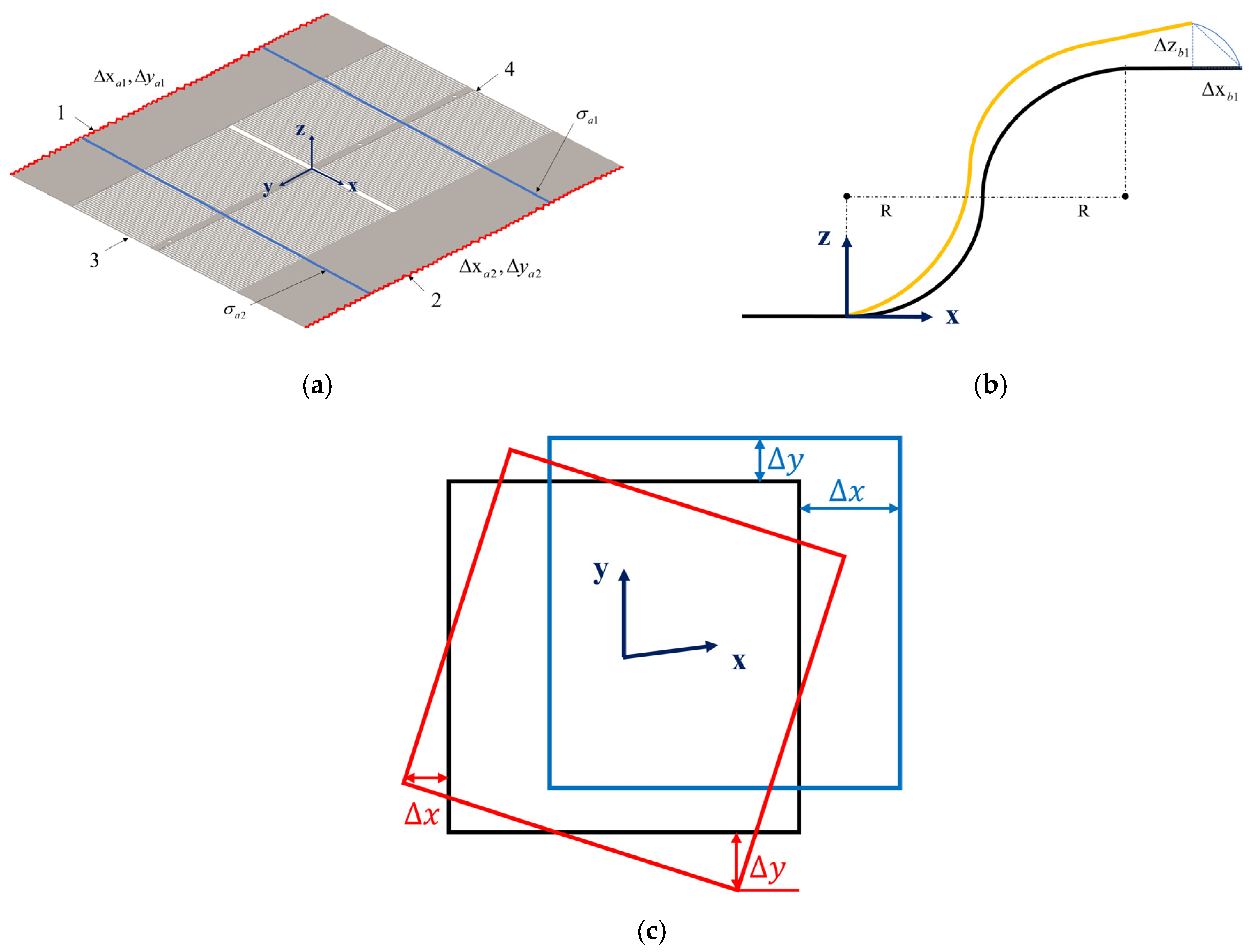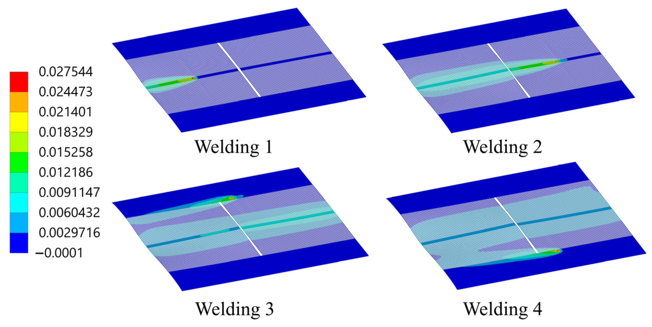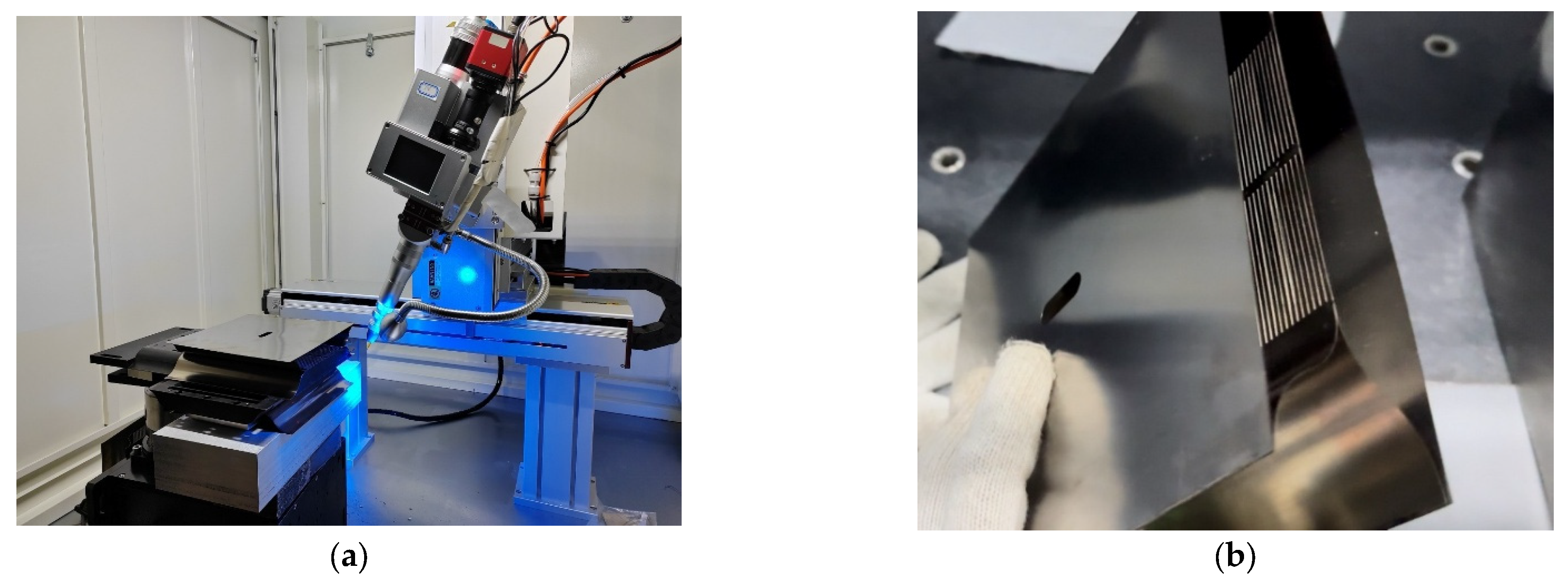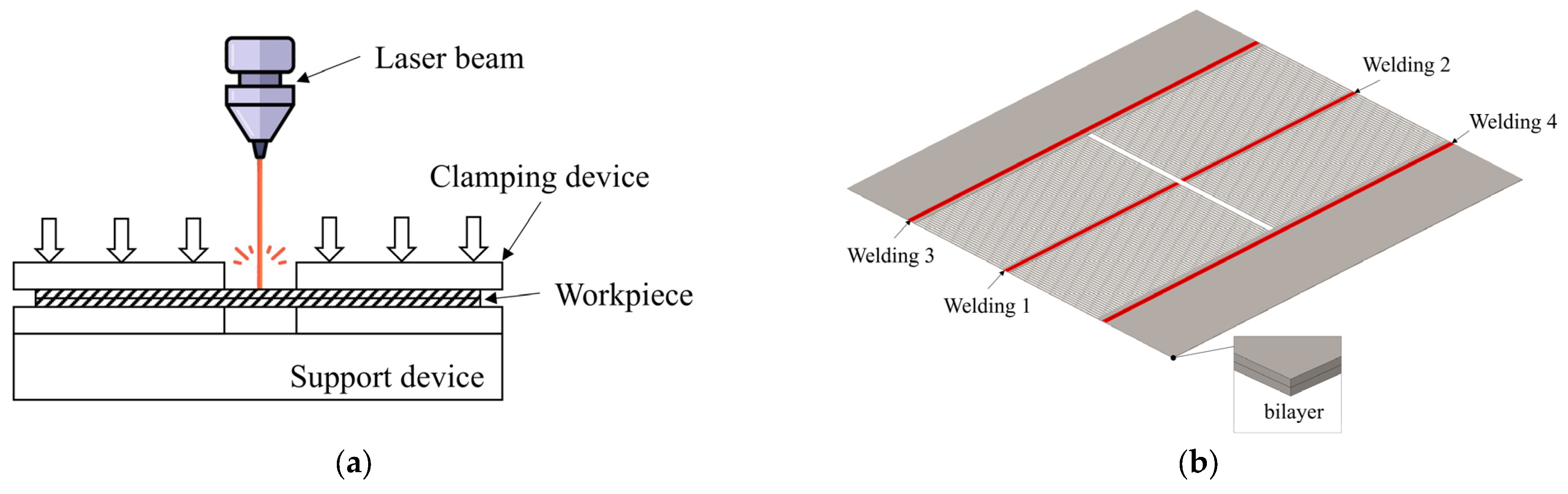 - Shao, C.; Ma, J.; Huang, S.; Lan, L.; Wu, G. Numerical simulation study on laser welding deformation of curved sandwich structure. J. Mech. Eng. 2025, 61, 121–132. (In Chinese) [Google Scholar]