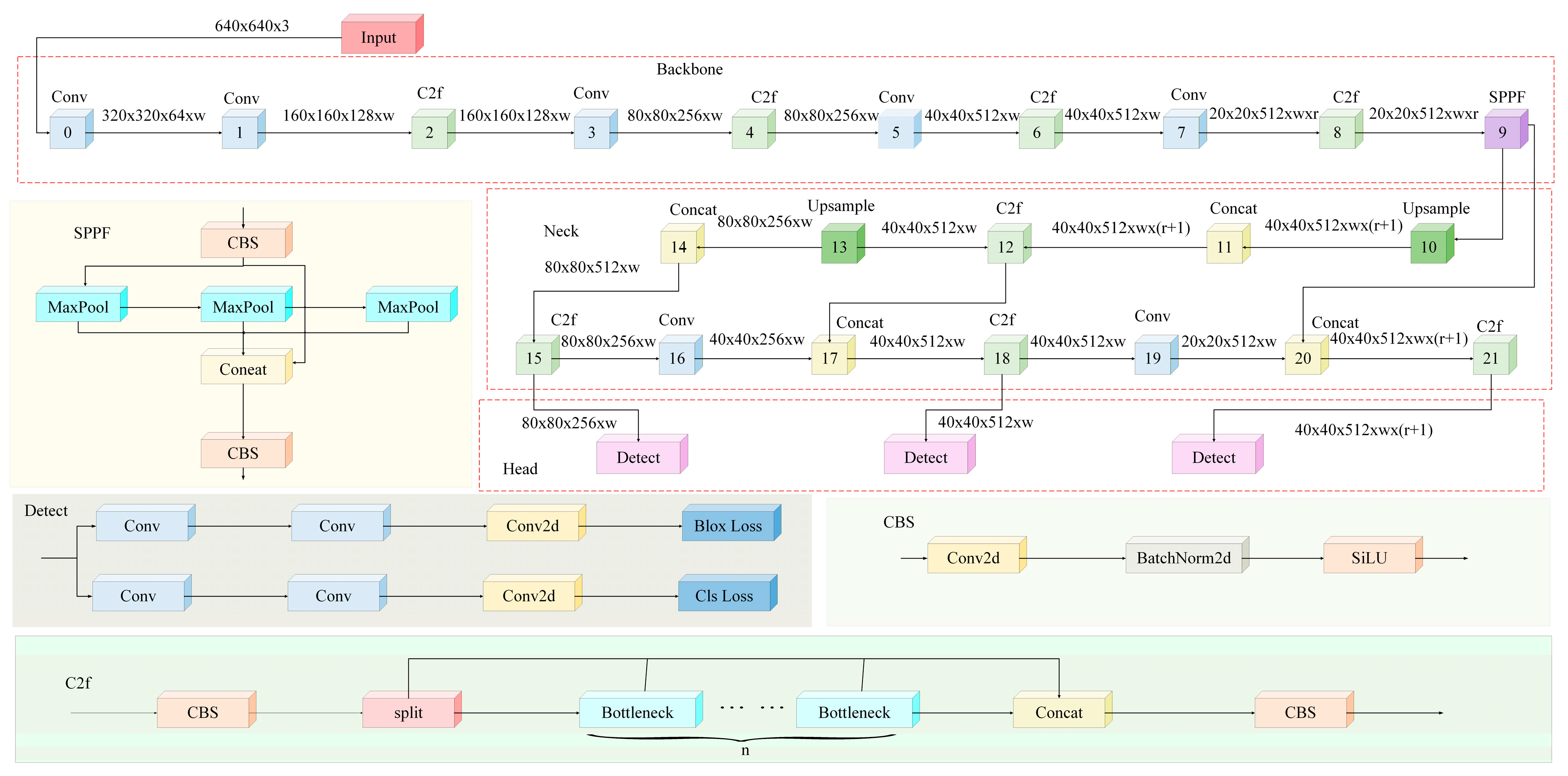 24] was released by the Ultralytics team in 2023. As an important update of the YOLO series, its architecture continues the four-stage design of the input end, backbone network, feature fusion network, and detection head. The structure diagram of YOLOv8 is shown in