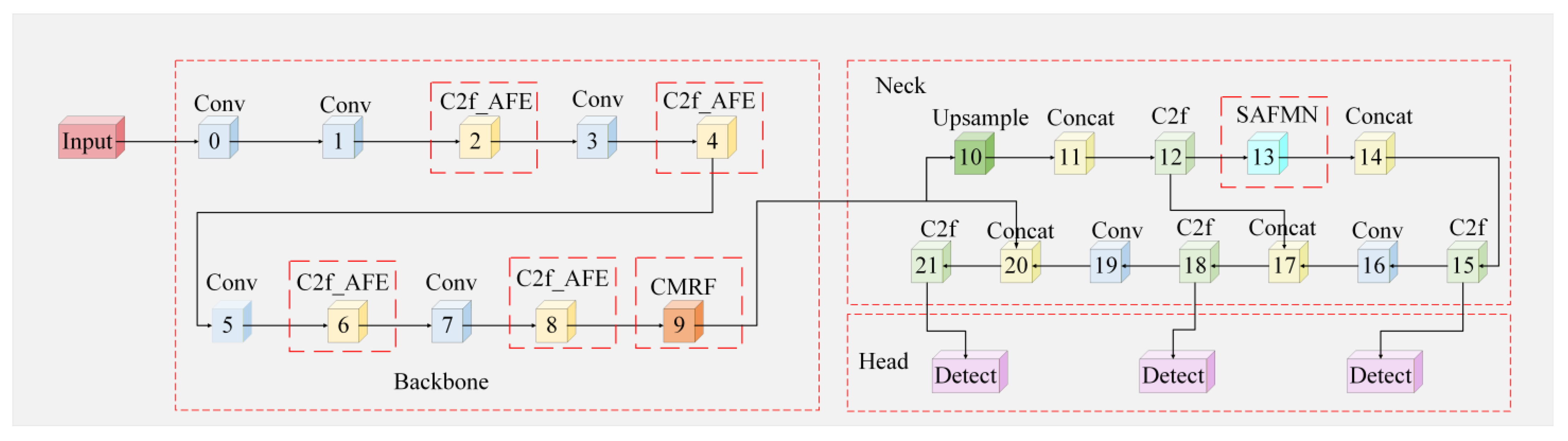 C2f_AFE module: Enhances cross-regional feature dependencies and fine-grained analysis, improving multi-scale feature representation in complex scenarios. CMRF module: Efficiently mines multi-scale receptive fields through a cascading strategy, alleviating redundancy and performance bottlenecks of traditional multi-scale modules. SAFMN module: Combines convolution channel mixing to optimize cross-scale feature fusion and preserve fine details, mitigating feature blurring during the upsampling stage.