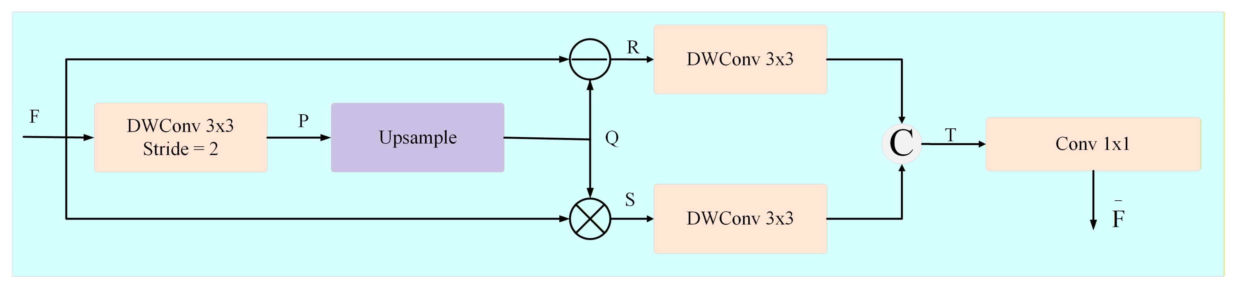 Differentiation enhancement: For low-frequency features Q (corresponding to global semantics), enhance the spatial consistency through element-wise multiplication + DWConv 3 × 3; for high-frequency features R (corresponding to small-target details), retain and enhance the local response through DWConv 3 × 3;
