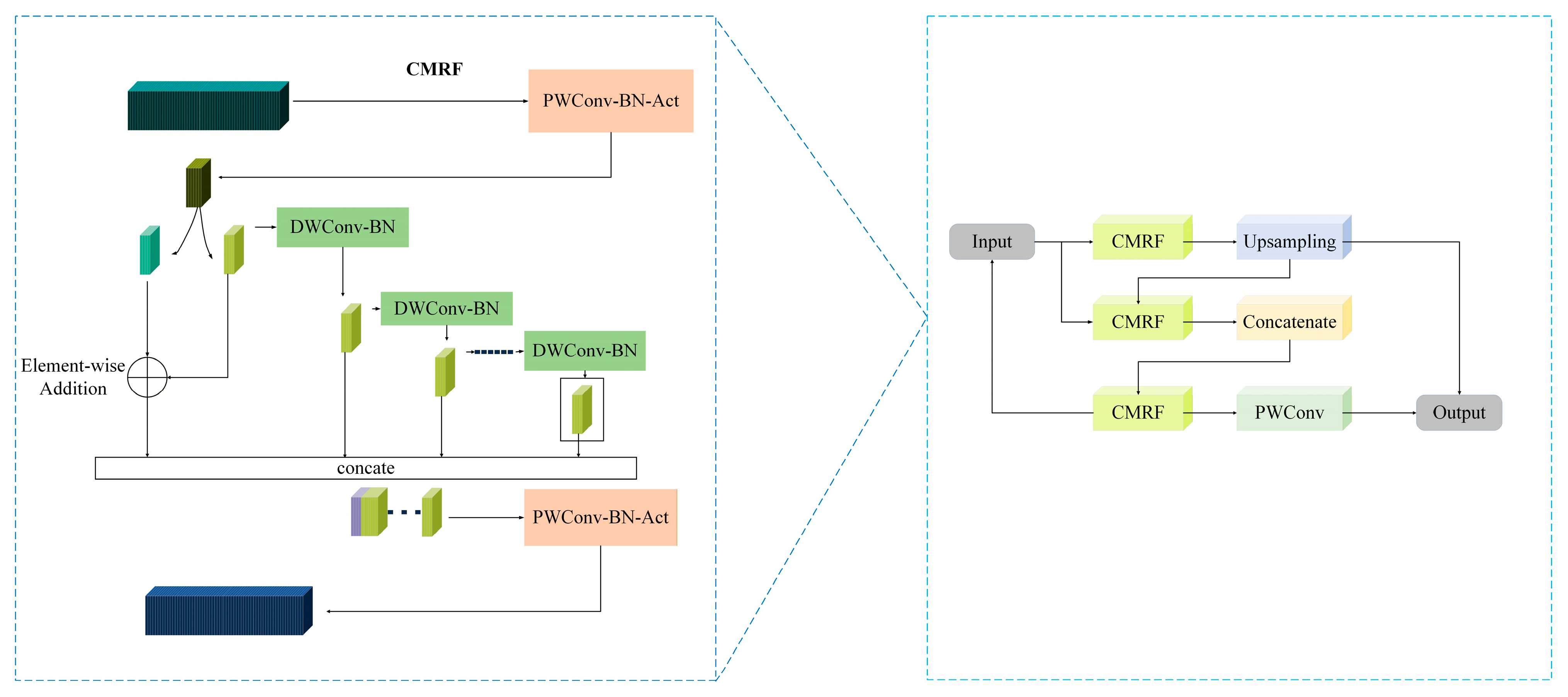 In image segmentation and target detection, existing models generally face a contradiction between efficiency and accuracy: although compression parameters and calculations improve efficiency, they weaken feature expression, leading to a decline in low-resolution image and small-target detection performance; although the multi-receptive field module improves feature modeling, it has a high computational overhead and is not conducive to resource-constrained scenarios. To this end, this paper proposes the cascaded multi-receptive field module (CMRF) structure as shown in