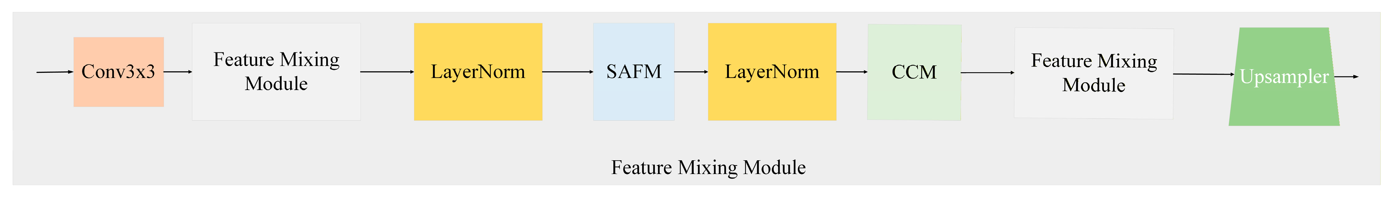 Figure 7. Its core module, FMM, consists of spatial adaptive feature modulation and a convolution channel mixer. The input image is first mapped to the feature space through shallow convolution, and then FMM uses multi-scale feature division and transformation, and combines with global residuals to enhance high-frequency information to achieve deep feature extraction and high-resolution reconstruction: