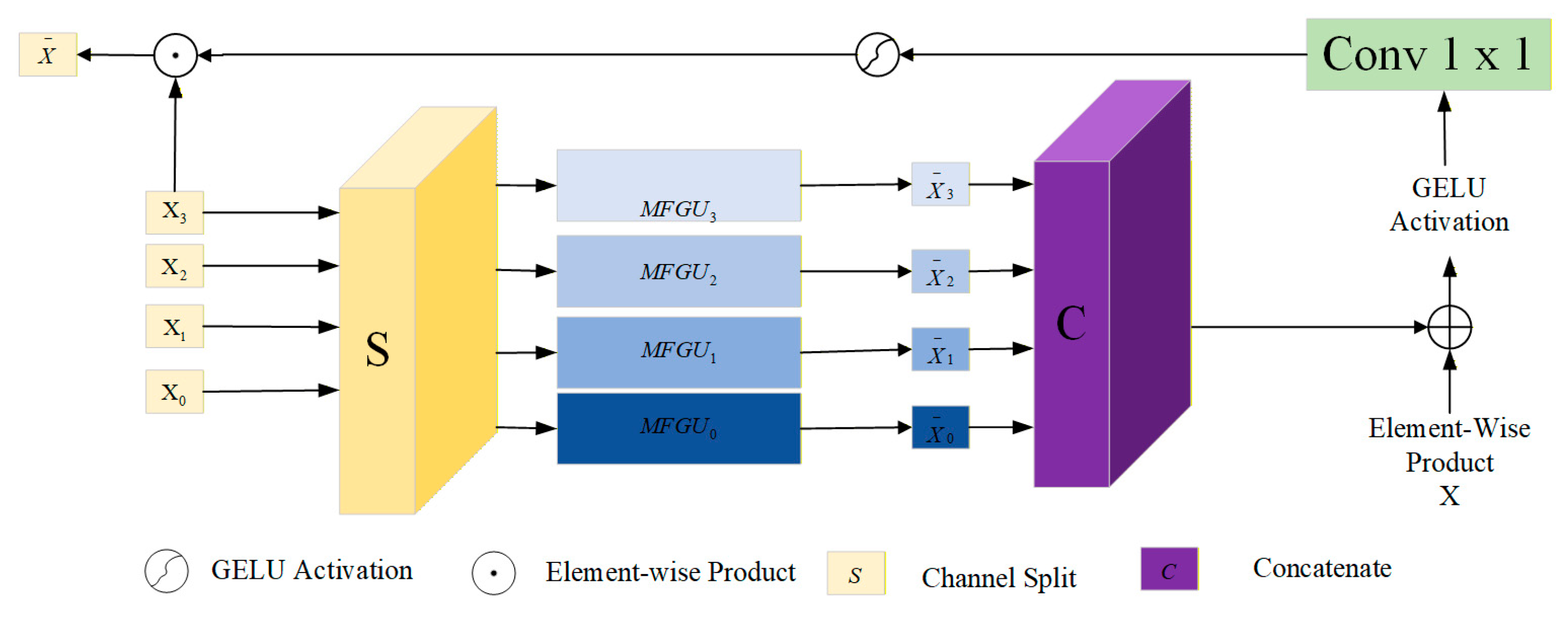 This design effectively enhances non-local feature modeling and multi-scale representation. To further integrate local contextual information and channel interactions, the CCM uses a compact combination of 3 × 3 and 1 × 1 convolutions—the 3 × 3 convolution captures spatial context and expands the channel dimension, while the 1 × 1 convolution restores it to the original scale and employs GELU activation to strengthen nonlinear representation. The update process of the FMM can then be summarized as follows: