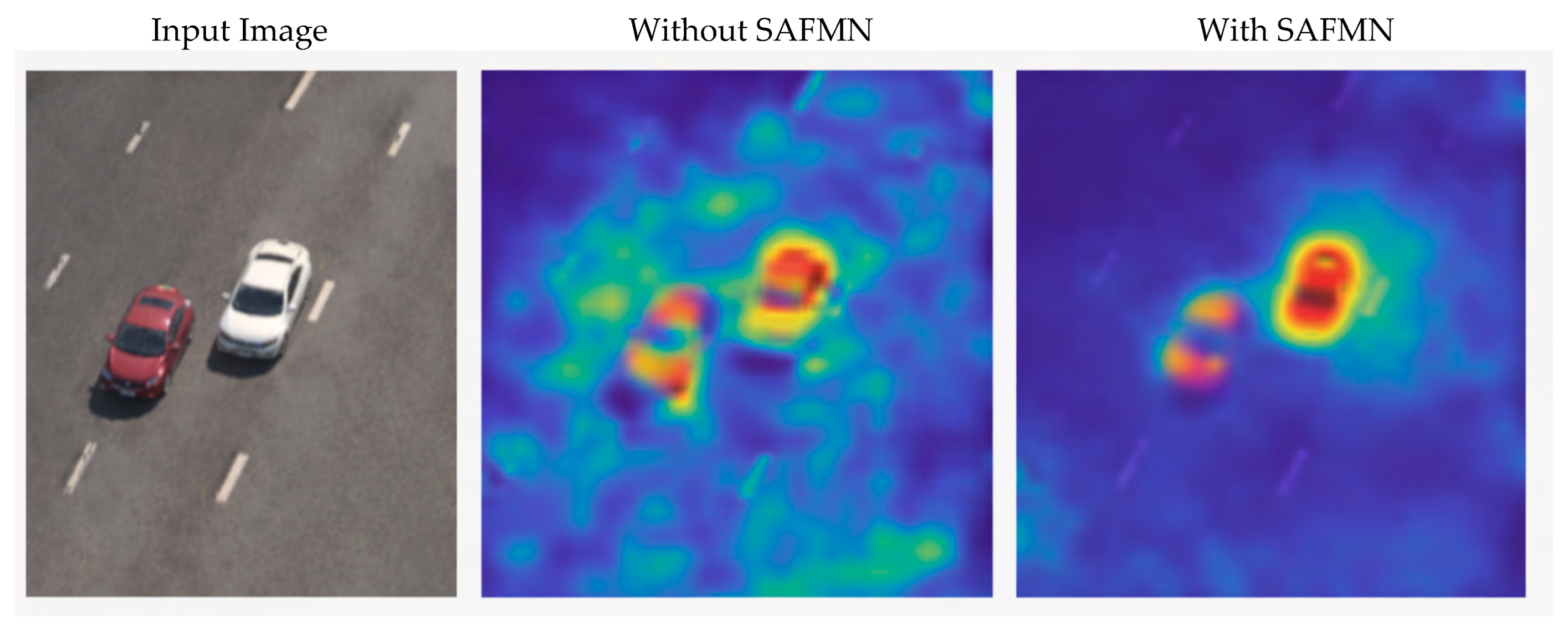 Figure 9, after introducing SAFMN, the responses of the upsampled features are more concentrated in the target regions, further validating the effective modulation of SAFMN during the feature upsampling process.