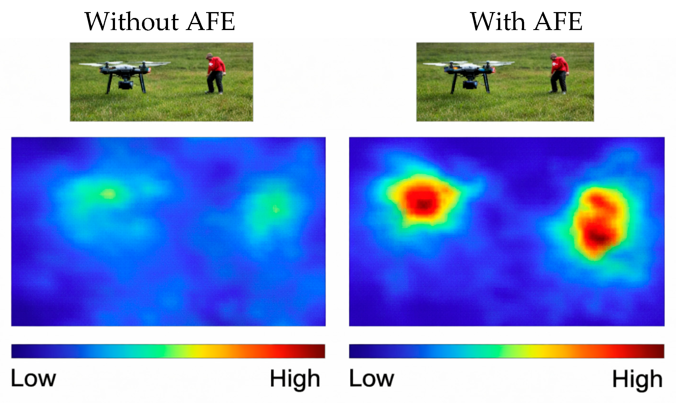 Table 1 further confirm that including AFE improves small-target detection metrics, demonstrating that AFE effectively enhances feature responses in the target regions. This visualization and ablation analysis substantiates the claimed relationship between AFE and small-target sensitivity.