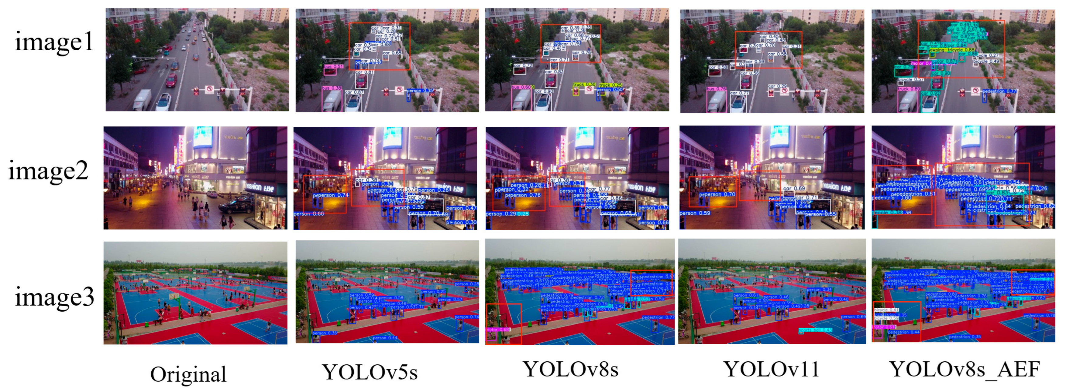 Figure 11 compares the detection results of different algorithms in typical scenes. From top to bottom, the scenes depict a road, a nighttime commercial street, and a dense small-target environment. The columns show the detection results for the original image, YOLOv5s, YOLOv8s, YOLOv11, and ACS-YOLOv8s, respectively. YOLOv5s and YOLOv8s exhibit missed detections and false positives, while YOLOv11 shows moderate improvement but remains limited. In contrast, ACS-YOLOv8s accurately detects all targets, with bounding boxes closely fitting object boundaries and minimal false detections, demonstrating superior accuracy and robustness in complex conditions.