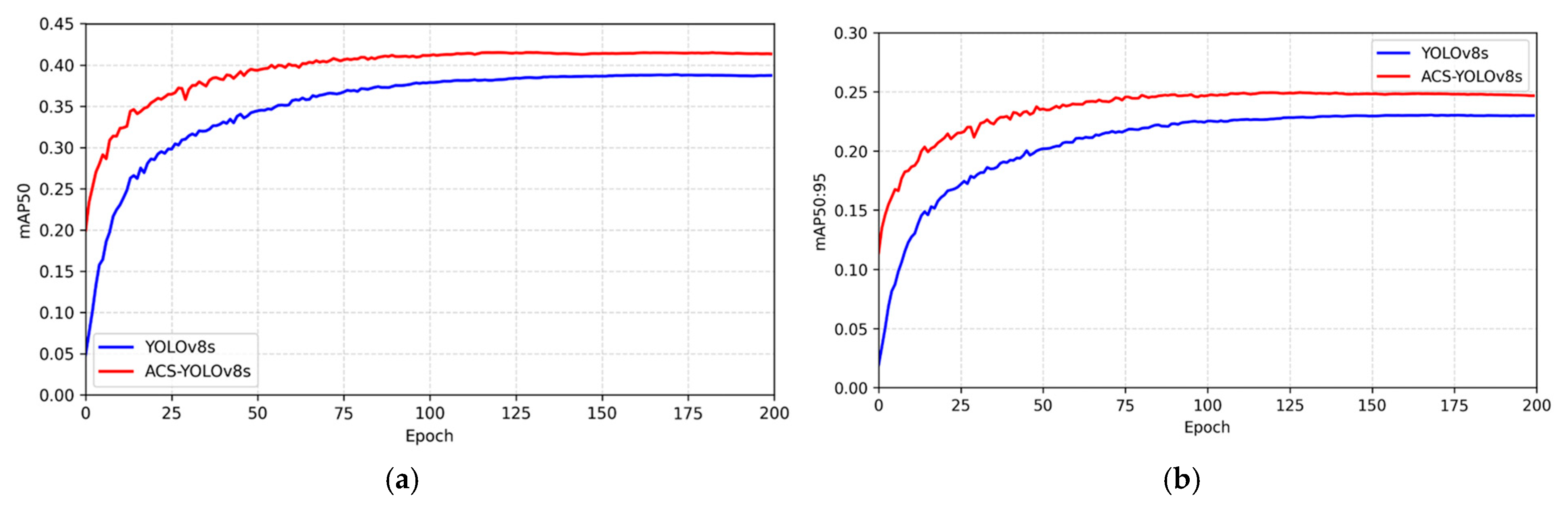 Extensive experiments on the VisDrone2019 dataset demonstrate that ACS-YOLOv8s significantly improves small-target detection accuracy, recall, and mAP compared with baseline models, while maintaining high computational efficiency.