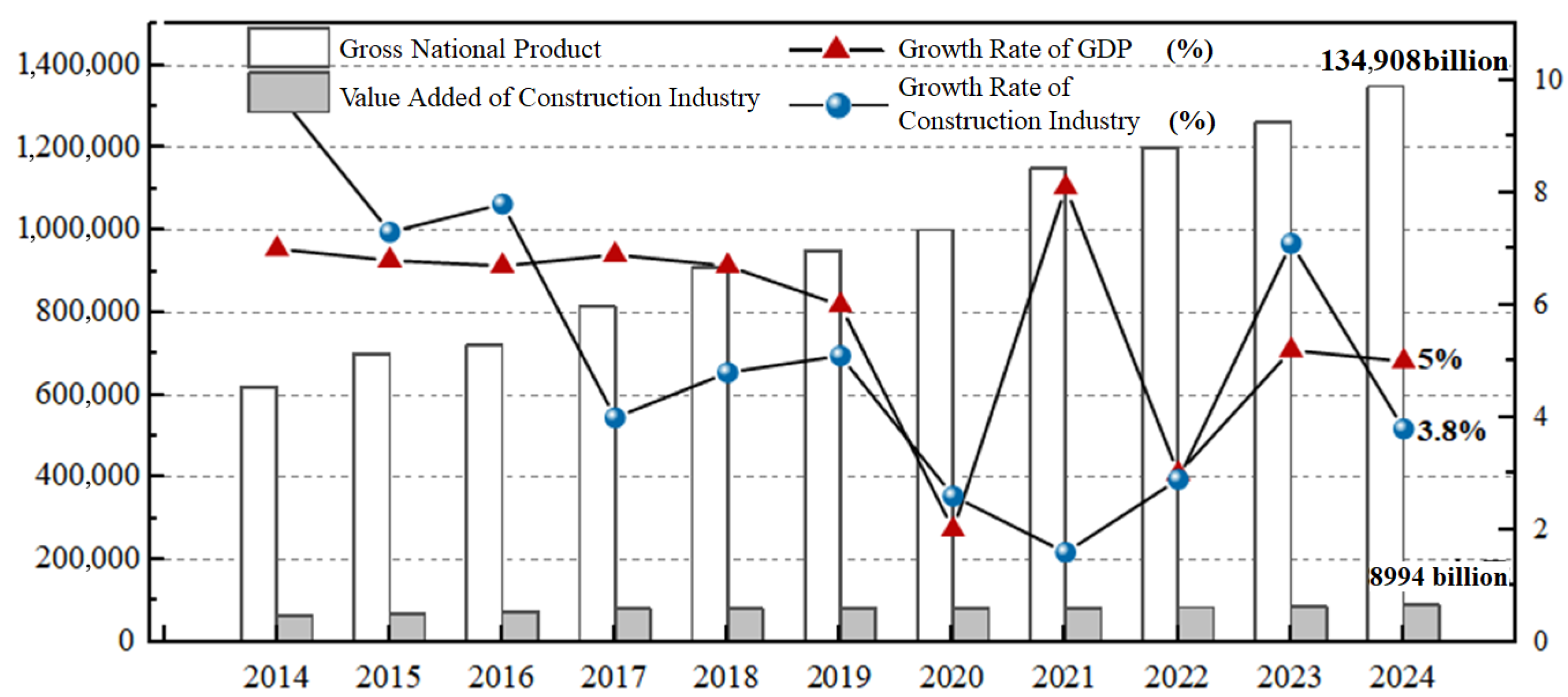 Figure 1, the added value of the construction industry in 2024 reached CNY 8994.9 billion, which has made important contributions to the growth of the national economy and the improvement of people’s lives. However, while the construction industry is developing rapidly, it is also facing a severe safety production situation. Especially in the construction stage, due to the complex working environment and frequent process crossing, the safety risks are highly concentrated. Previous studies have shown that the occurrence of construction accidents is closely related to human factors such as the illegal operation of operators, which is the core cause of construction safety accidents [