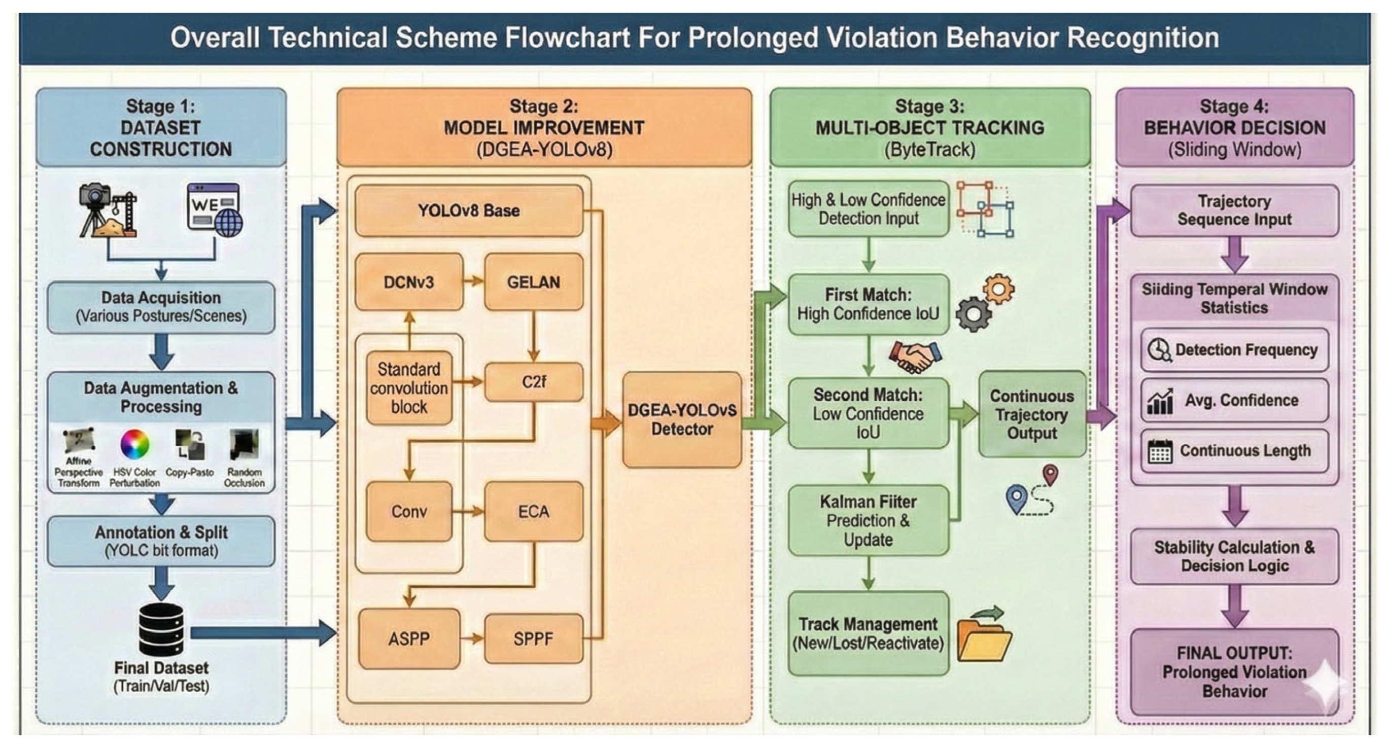 In construction behavior recognition, symmetry and asymmetry can be understood as the balance between data distribution and behavioral dynamics. Under ideal conditions, standardized operational behaviors exhibit a certain degree of spatiotemporal symmetry. However, prolonged violations such as “playing with mobile phones” disrupt this balance, resulting in significant spatiotemporal asymmetry. To address the numerous shortcomings of existing models in recognizing Prolonged violation behaviors of key personnel in construction scenarios, this paper proposes an integrated recognition framework, the DGEA-YOLOv8 algorithm, combining an improved YOLO-based object detection model with a lightweight multi-object tracking algorithm. The specific implementation process of this plan is shown in