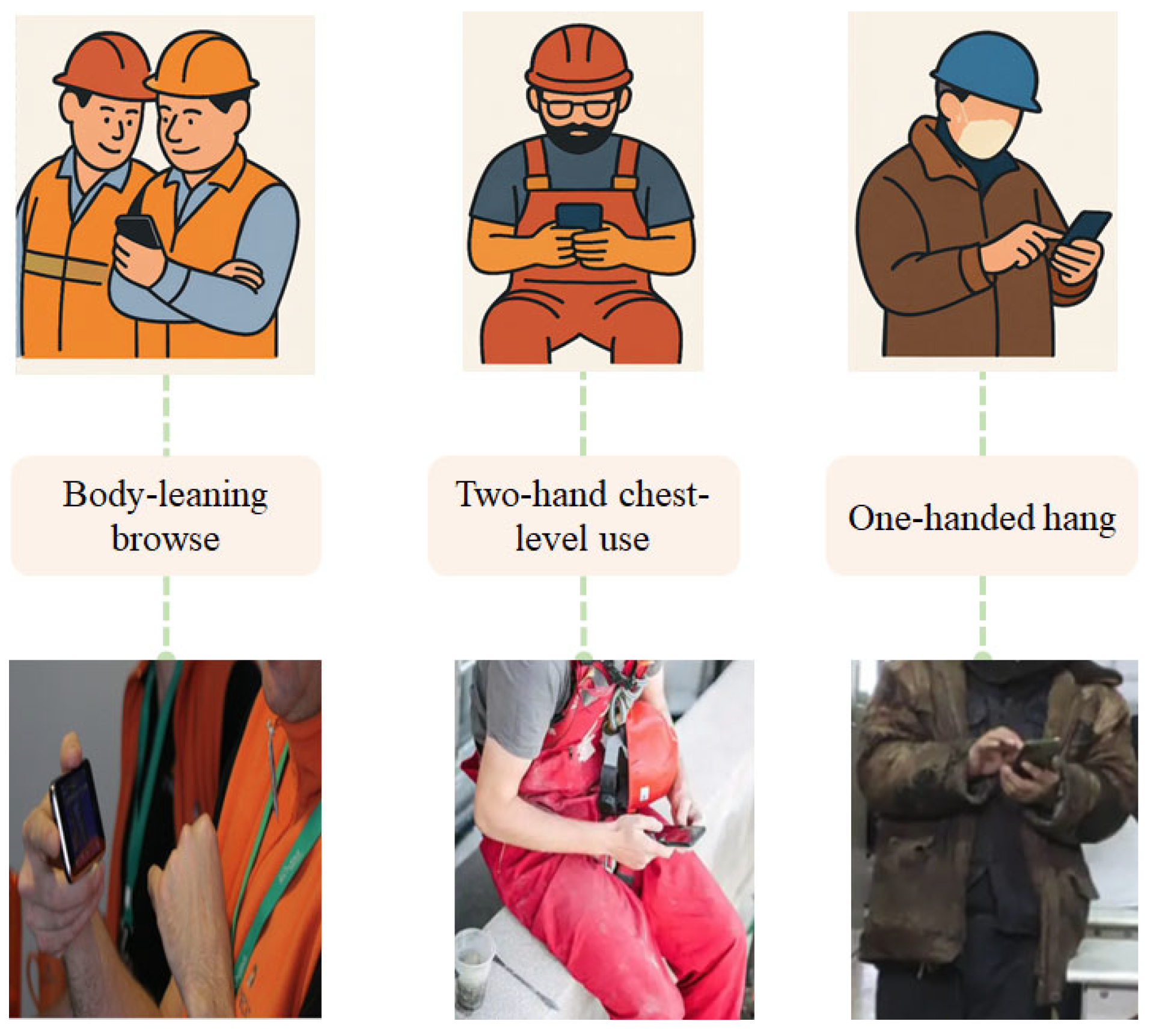 In the process of constructing the dataset of “mobile phone usage” behavior in key positions, this paper fully incorporates the perspective of ergonomics. By using web crawlers and construction video detection platforms, etc., it systematically collected image samples of construction workers using mobile phones in different postures in the actual working environment. For behaviors observed while standing, the data includes actions such as one-handed hanging, two-handed operation in front of the chest, and body-leaning browsing. In seated scenarios, samples cover typical behaviors like forward leaning, reclining relaxation, and side compensation, to capture more real-world instances of abnormal body posture during work. Additionally, for precise object recognition, this study focuses not only on the overall body movement features but also on detailed visibility factors of the mobile phone itself, including screen on/off states, phone orientation, brand, and size, to enhance the model’s ability to detect small and occluded targets. Beyond focusing on the interaction between the person and the phone, the study also categorizes behaviors based on typical actions, such as one-handed or two-handed holding, typing, and screen scrolling, ensuring a fine-grained distribution of behavior samples in the dataset.