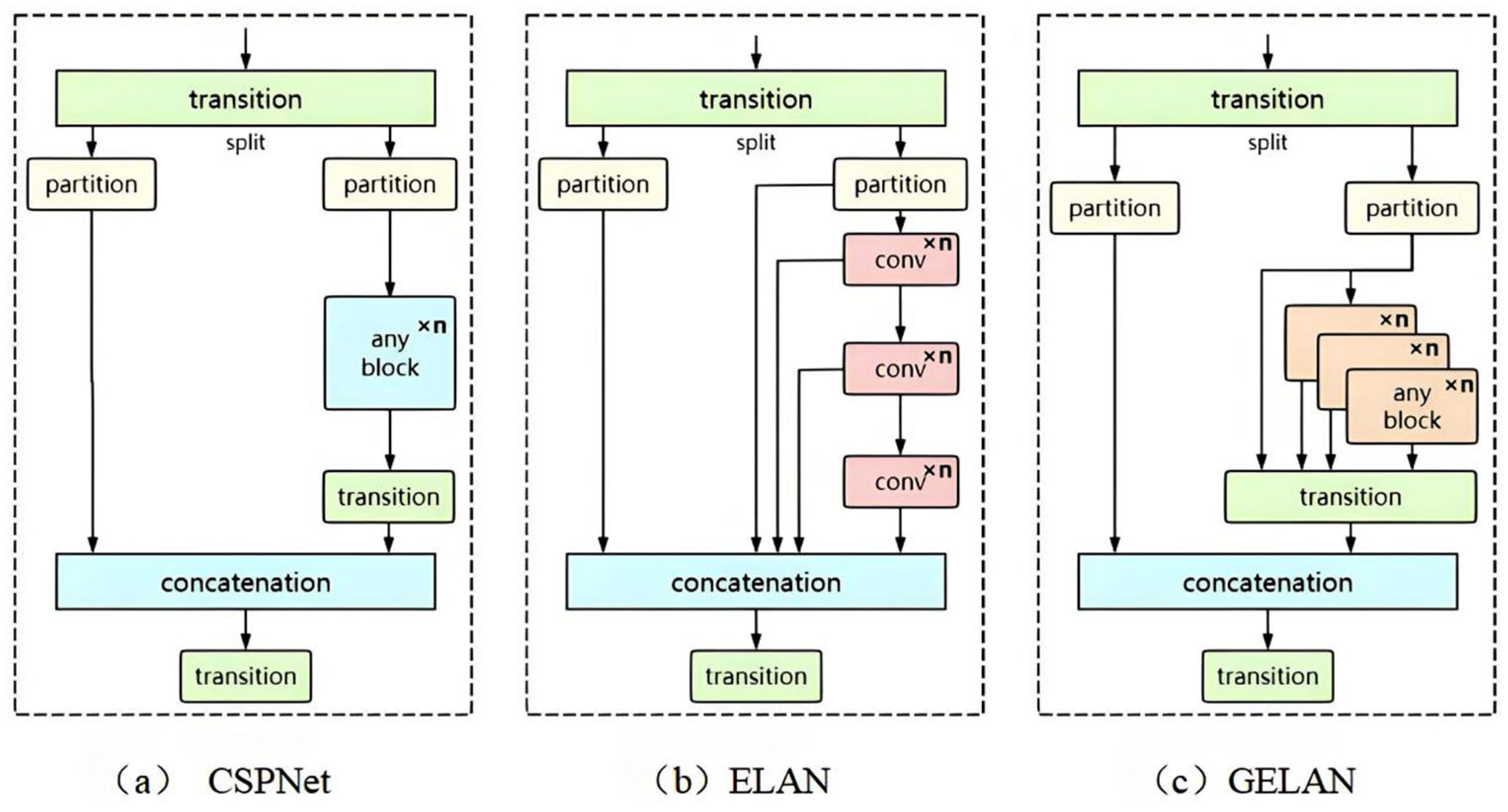 The GELAN architecture combines the strengths of CSPNet and ELAN, creating a lightweight module with efficient feature representation and strong inference performance. As shown in