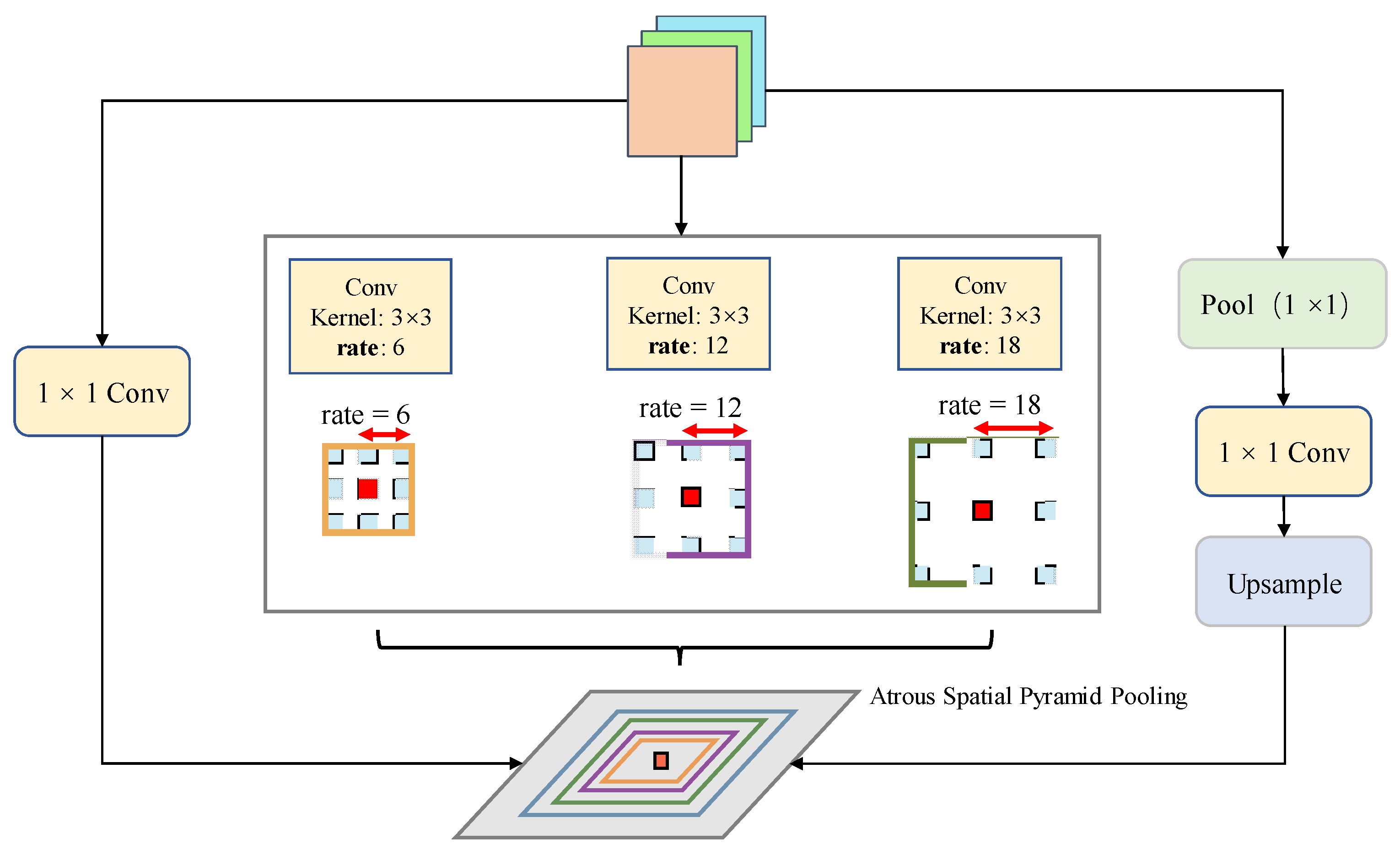The Atrous Spatial Pyramid Pooling (ASPP) structure extracts multi-scale features by applying dilated convolutions with different dilation rates, enabling more comprehensive capture of spatial information across objects of various sizes and enhancing the model’s ability to represent multi-scale features and contextual semantics [