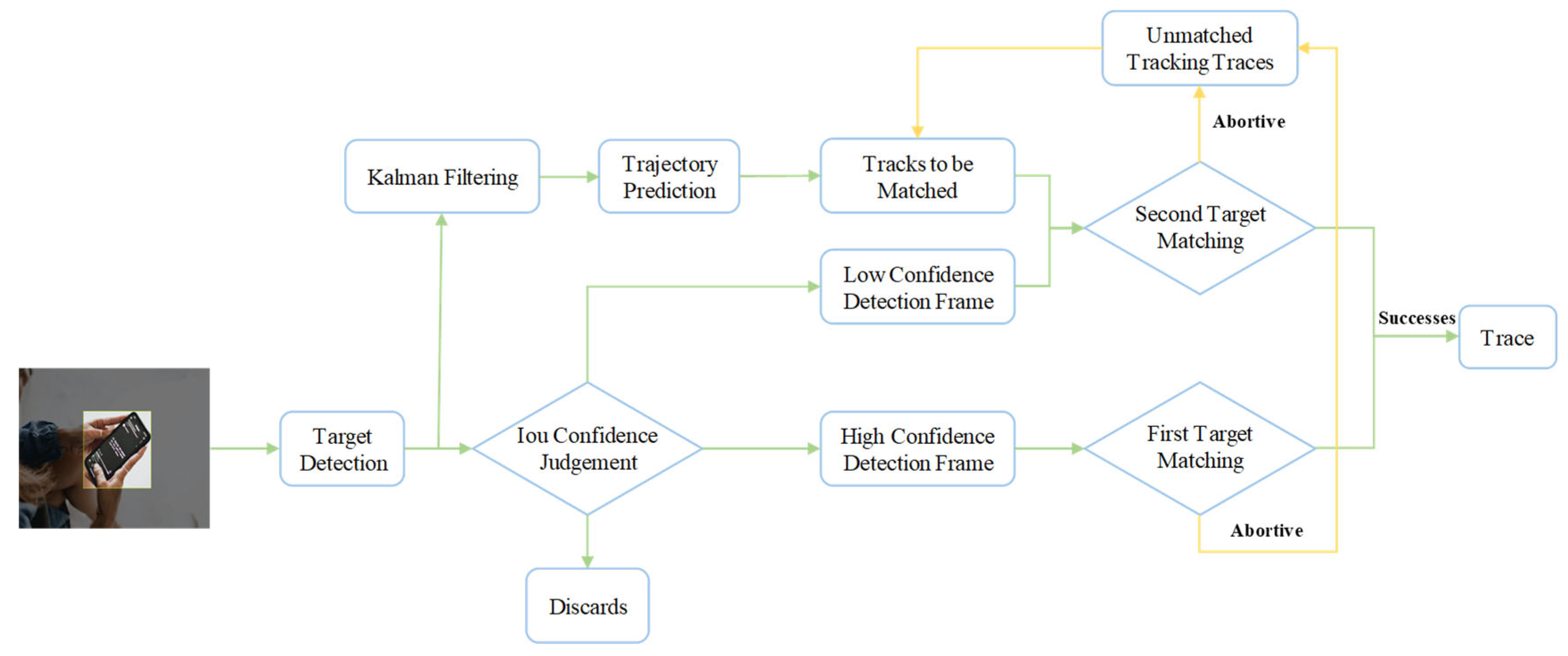34]. Built on the Tracking-by-Detection paradigm, it repeatedly matches and updates detected targets throughout the tracking process, achieving both computational efficiency and robustness to occlusion while ensuring continuity in target trajectories. This makes it well-suited for scenarios with frequent occlusions and overlapping target movements. The core idea of ByteTrack is a simple yet effective byte-level tracking strategy that integrates information across frames, reduces ID switches, and suppresses background noise, thereby enhancing tracking stability and accuracy. For prolonged violation behaviors such as “playing with mobile phones,” where visual cues are subtle, ByteTrack shows particular advantages through its low-confidence detection box retention mechanism. By combining both high- and low-confidence detections, it increases coverage, prevents trajectory interruptions caused by temporary occlusion or weak movements, and reduces detection loss.