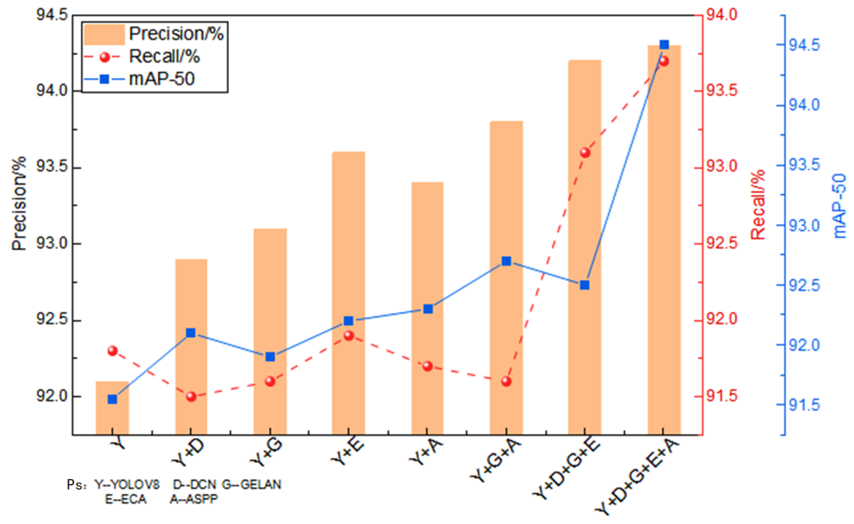 From the comparative experimental results, DGEA-YOLOv8 achieved the best performance in Precision, Recall, and mAP-50, reaching 94.3%, 93.7%, and 94.50%, respectively. Compared with YOLOv8, these values improved by 2.2%, 1.9%, and 2.95%. However, FPS decreased by 7.2 f/s. Both YOLOv8 and YOLOv5 performed well in Precision and Recall, with YOLOv8 achieving 92.1% Precision, 91.55% mAP-50, and 109.5 f/s. In contrast, SSD showed lower Precision, Recall, and mAP-50 than YOLOv5, YOLOv8, and DGEA-YOLOv8. Overall, DGEA-YOLOv8 demonstrated superior accuracy and computational efficiency, making it more suitable for high-precision requirements in real construction scenarios.