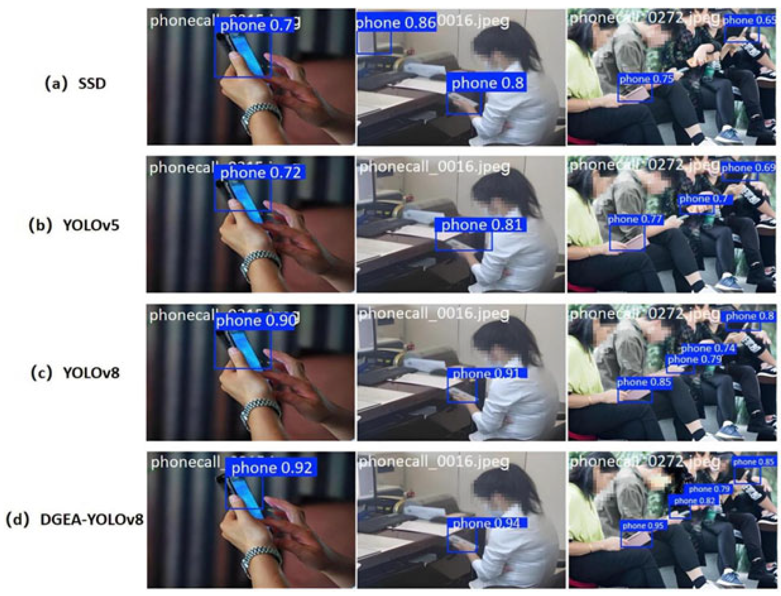In order to further intuitively analyze the performance and detection effect of DGEA-YOLOv8 algorithm, this paper takes SSD, YOLOv5 and YOLOv8 as comparison items, and judges them from four indicators: input size, accuracy, recall rate, mAP-50 and FPS. The performance comparison table is shown in