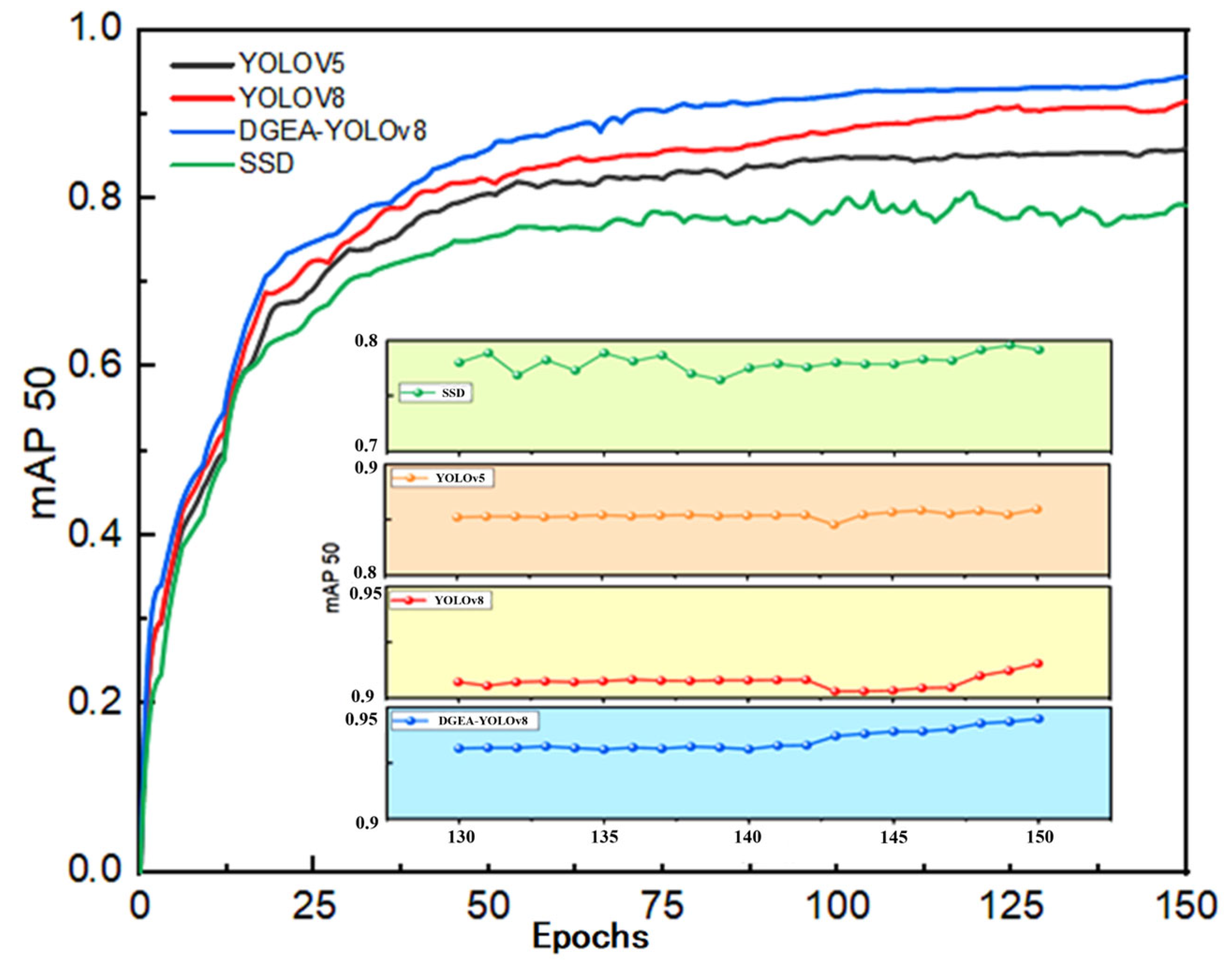 Figure 13 further compares the relationship between training epochs and mAP-50 for YOLOv5, YOLOv8, DGEA-YOLOv8, and SSD. The results show that YOLOv5 improved rapidly at the early stage but plateaued at a lower final accuracy. YOLOv8 performed better initially, with a rapid increase in mAP-50, but its final result was slightly inferior to DGEA-YOLOv8. By contrast, DGEA-YOLOv8 exhibited steady and consistent improvement throughout training, achieving a final mAP-50 significantly higher than YOLOv5 and YOLOv8, demonstrating the best training effect. SSD, however, lagged behind with a slower curve and lower final accuracy. The subfigures further illustrate the mAP-50 trends at different stages, providing an intuitive comparison of learning curves and convergence rates. Overall, DGEA-YOLOv8 showed the most robust performance during training.