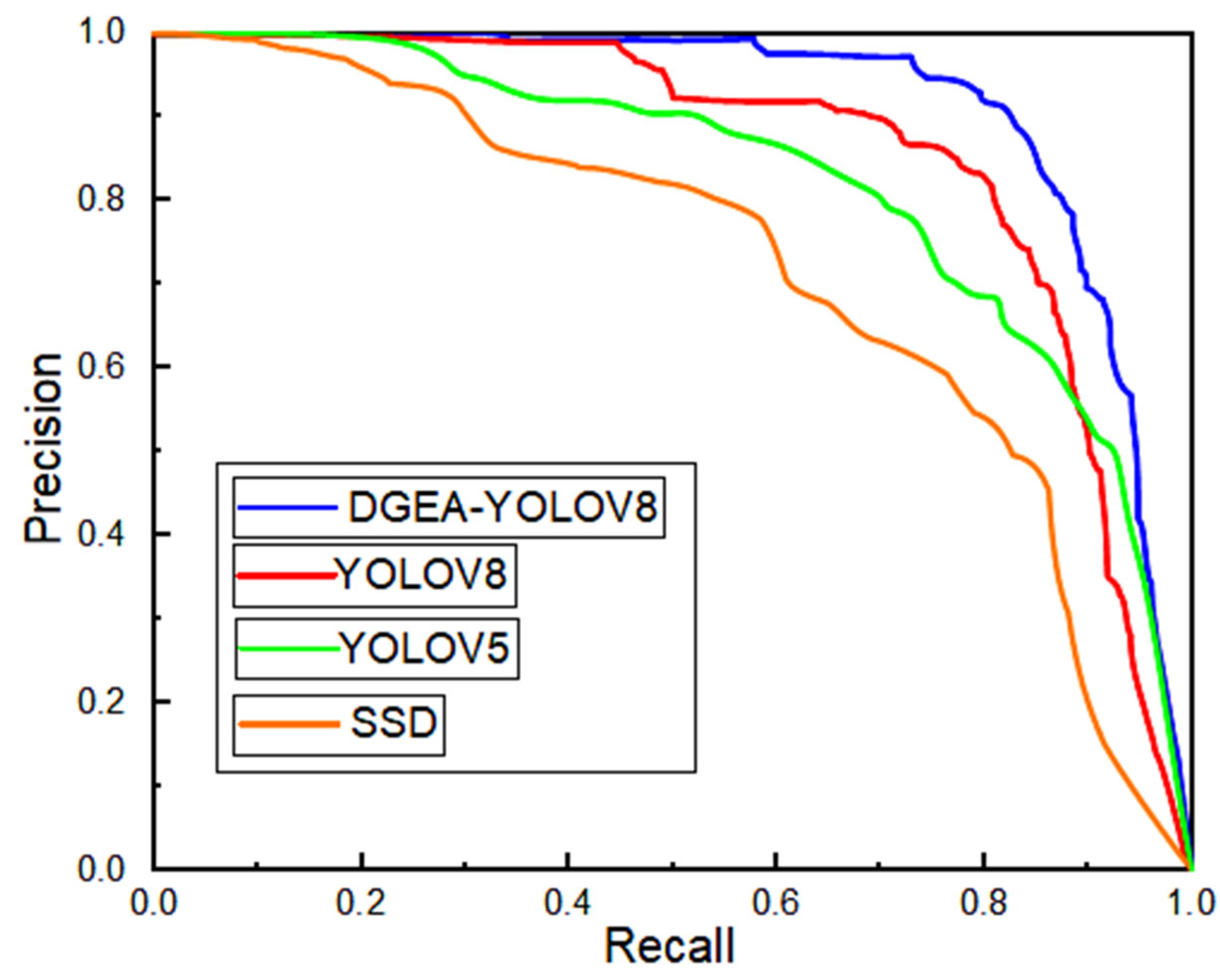 Figure 14 presents a comparison of PR curves between the proposed improved algorithm and other related models, providing an intuitive analysis of the relationship between Precision and Recall. The DGEA-YOLOv8 algorithm (blue line) consistently maintains high values for both precision and recall, with its curve positioned above the others, demonstrating a clear advantage in balancing accuracy and completeness. YOLOv8 (red line) and YOLOv5 (green line) intersect, but the larger area under YOLOv8’s PR curve indicates its superior performance over YOLOv5. In contrast, the SSD model shows the lowest curve, with precision and recall values significantly below the other three models. Overall, DGEA-YOLOv8 achieves the best balance between precision and recall, confirming its strong performance.