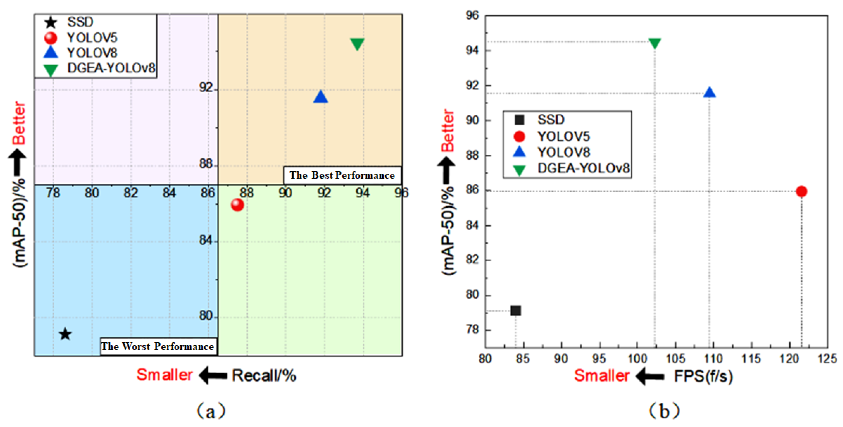 y-axis). The distribution reveals that YOLOv8 and DGEA-YOLOv8 are located in the upper-right corner, indicating a better balance between mAP-50 and Recall and thus superior performance. In contrast, SSD lies in the lower-left region, reflecting its relatively poor performance.
