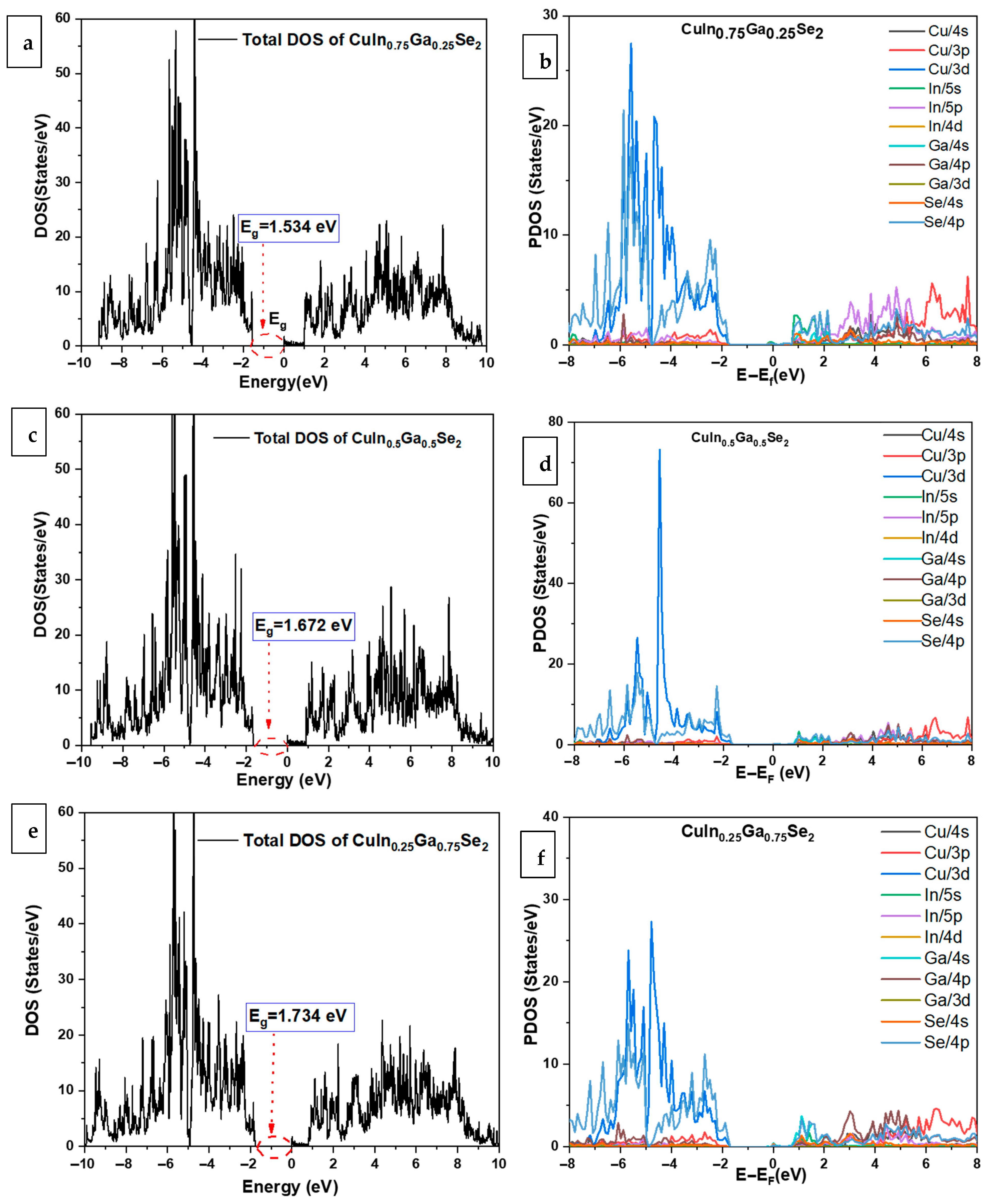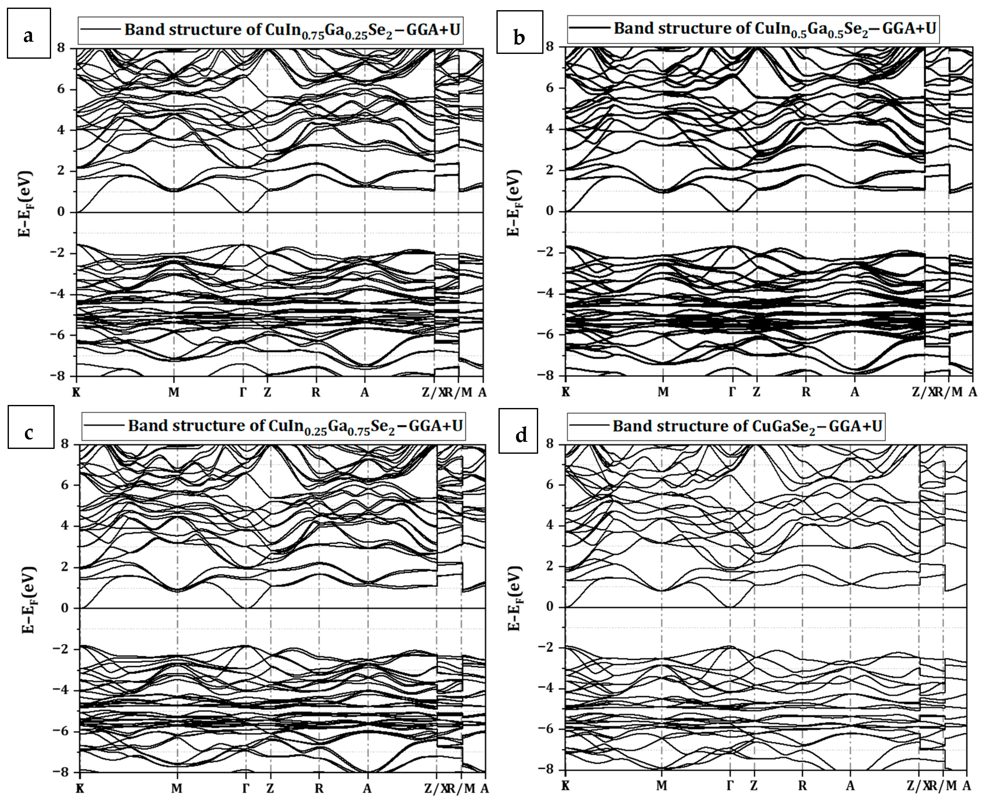 3.4. Band Structure and Densities of States of CuIn1−xGaxSe2 Compounds Using GGA+U