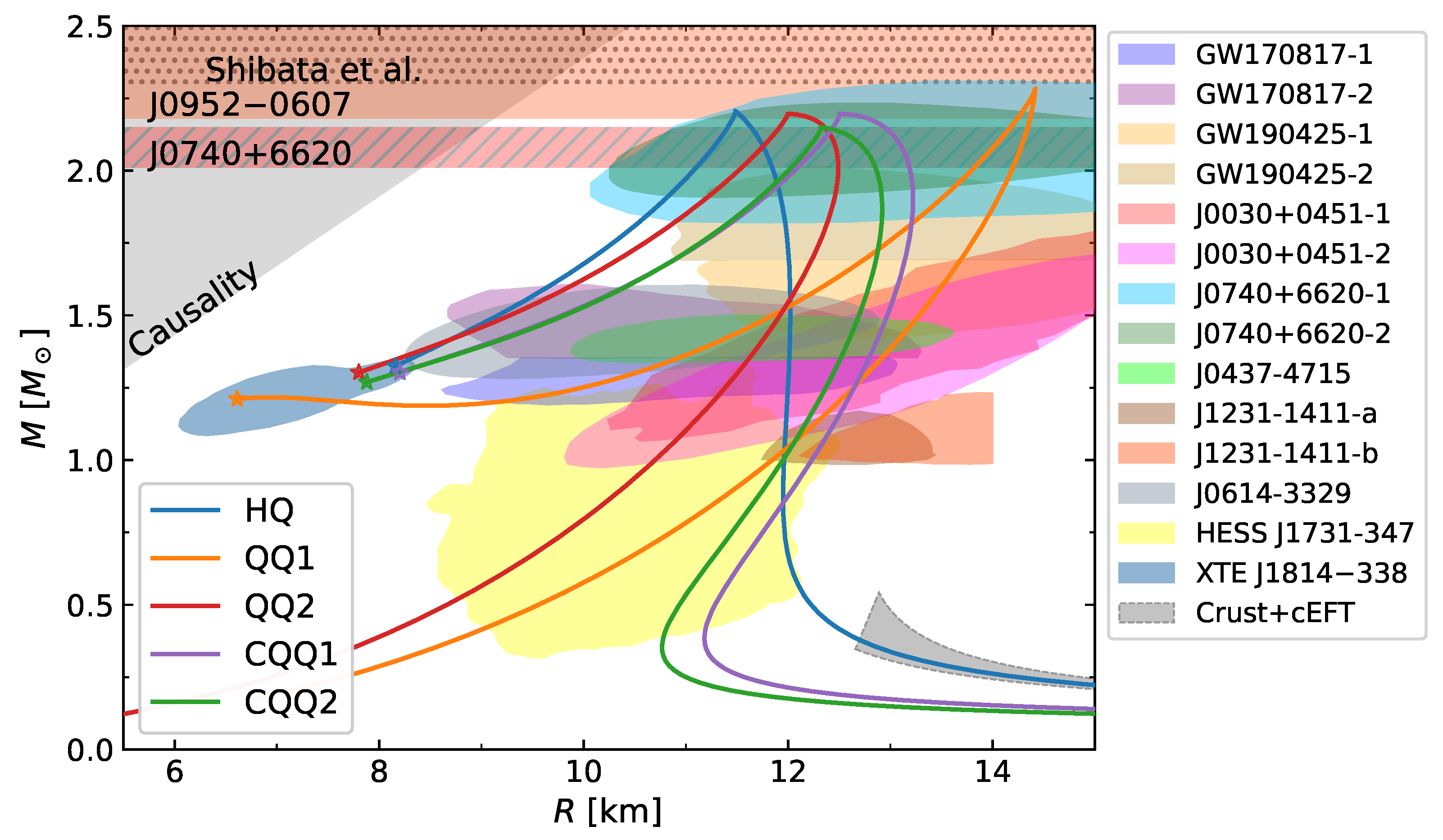 Figure 2. M-R relationship of the of the hybrid EOSs selected for the CSS ( β = 0 ) analysis. For all sets, we present only stable configurations, considering the slow conversion scenario; configurations beyond the maximum mass, up to the terminal one (star marks), belong to the SSHS branch. We also show astrophysical constraints from the ∼2 M pulsars [6,7,8,9,10], NICER pulsars [11,12,13,14,15,16,17], GW170817 [18,19] and GW190425 [20] events, the black widow PSR J0952-0607 [21], HESS J1731-347 [22], and XTE J1814-338 [23]. The upper horizontal dotted area is the region excluded by Shibata et al. [136], M max 2.3 M . The gray area in the right bottom corner indicates the TOV integration of the χ EFT EOS constraint (along with a BPS-BBP crust for lower densities); as already mentioned, this constraint does not apply to compact objects containing quark matter at such masses. The shaded region in the upper left corner indicates the causality forbidden zone.