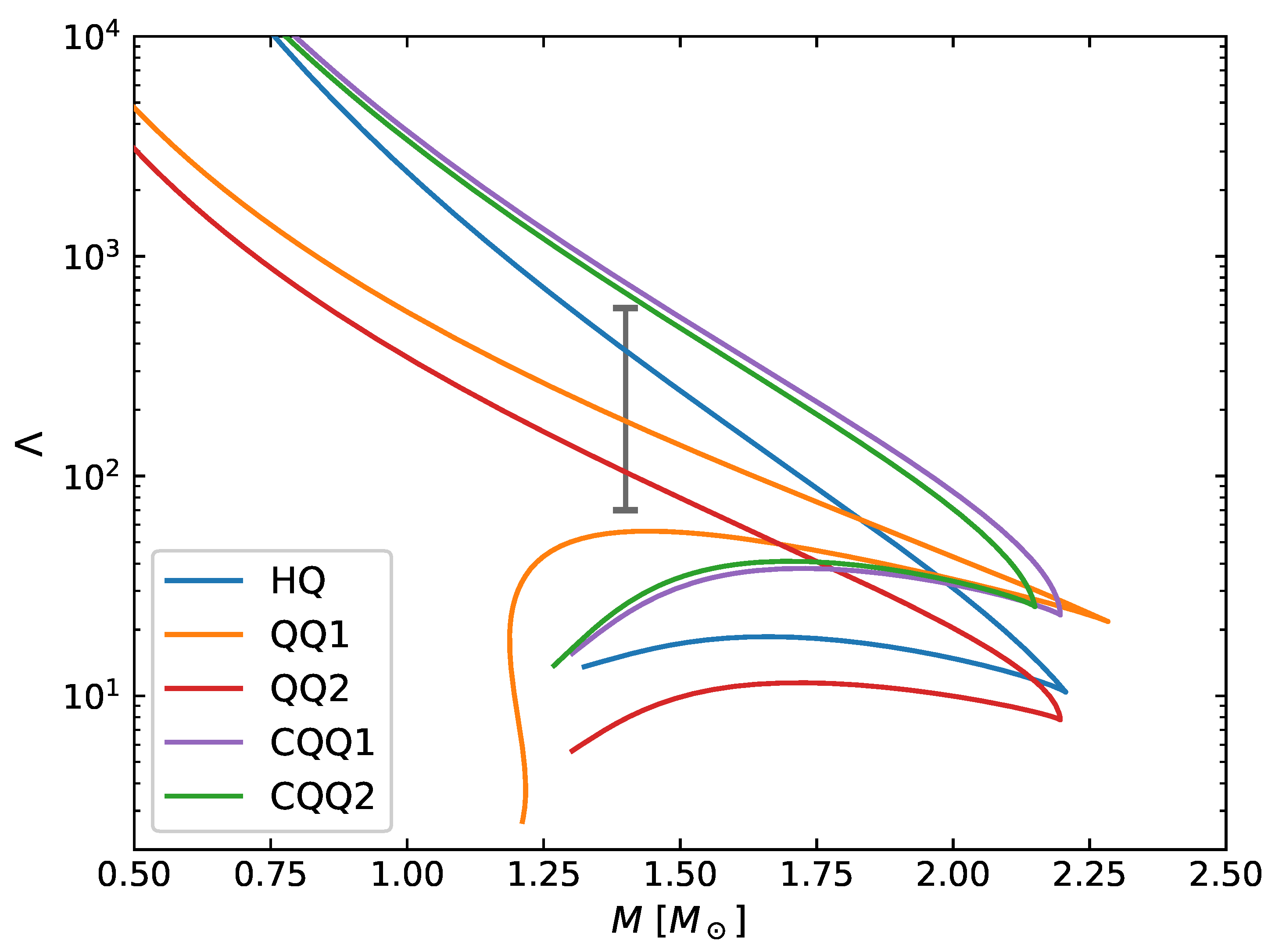 Figure 3. Λ -M relationship of the of the hybrid EOSs selected for the CSS ( β = 0 ) analysis. For all sets we present only stable configurations, considering the slow conversion scenario; configurations beyond the maximum mass, up to the terminal one at the end of the curve, belong to the SSHS branch. We also show the constraint obtained from the analysis of the multimessenger event with gravitational waves GW170817 [19]. The CQQ cases, although satisfying the M-R constraint for GW170817 (see Figure 2), does not satisfy the Λ one. All the other selected EOSs satisfy it trough the totally stable branch.