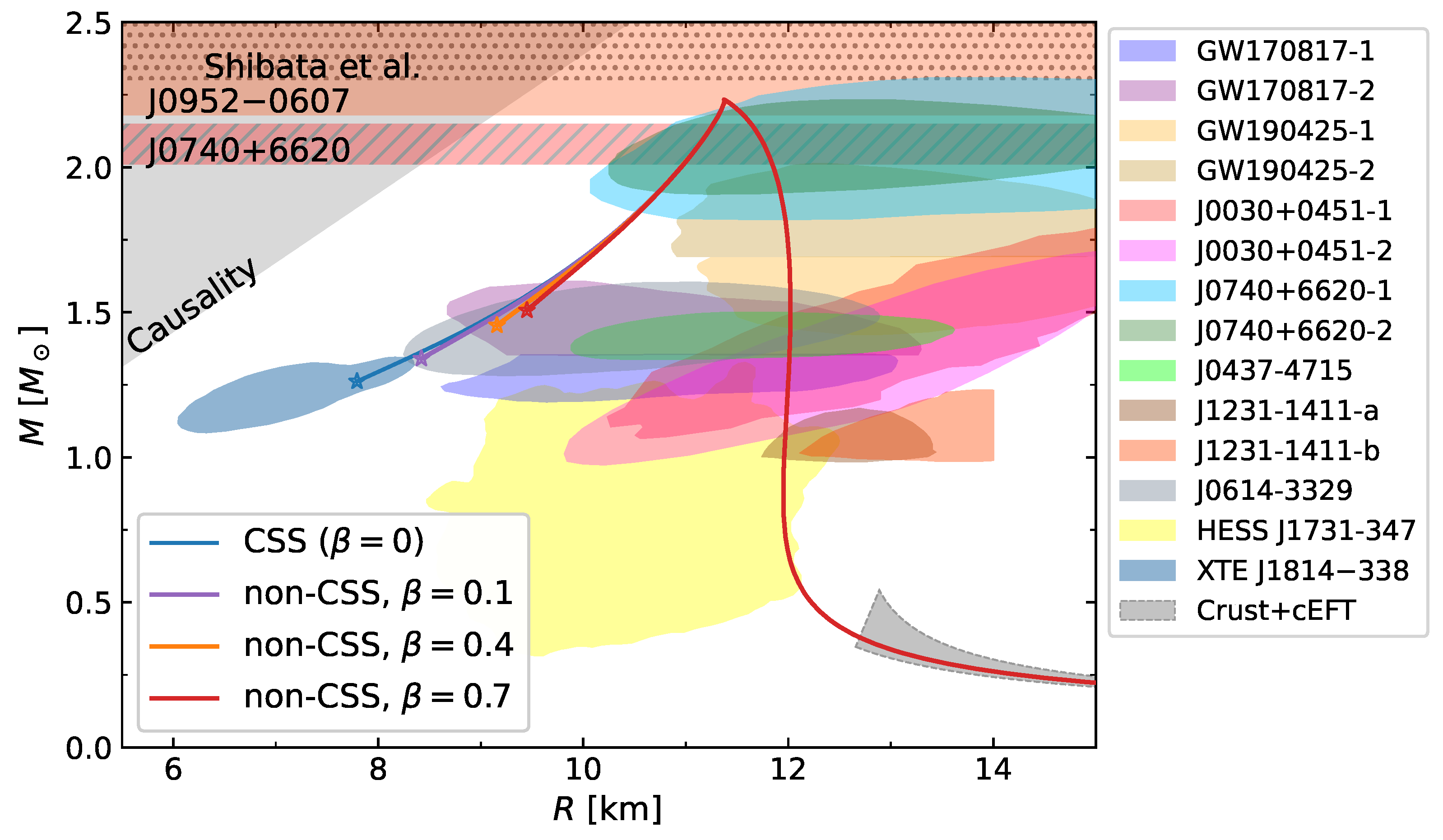 Figure 5. M-R relationship of the of the hybrid EOSs selected for the non-CSS ( β 0 ) analysis. For all sets we present only stable configurations, considering the slow conversion scenario, these being the configurations after the maximum mass one up to the terminal one (star marks) of the SSHS branch. Colored regions constraints are detailed in Figure 2. Except for the β parameter (detailed in the legend for each curve), the shared parameters for all curves are P t = 400 MeV/fm3, Δ ε = 2500 MeV/fm3, and c t 2 = 1.0 . The increasing β value, while helping satisfy the pQCD constraint, reduces the possibility of meeting the XTE J1814-338 constraint.