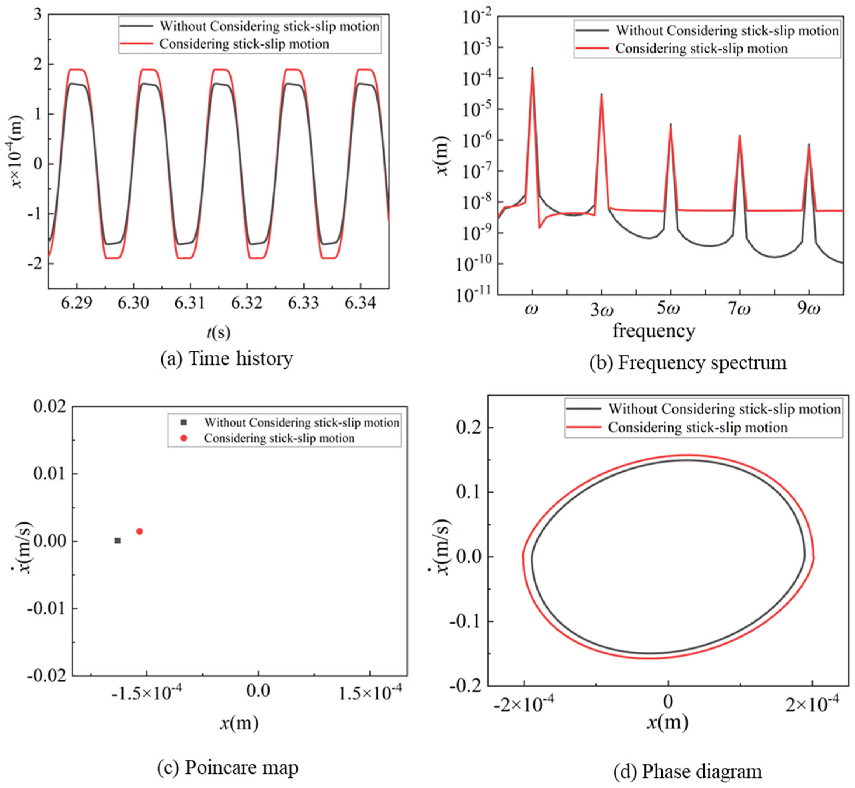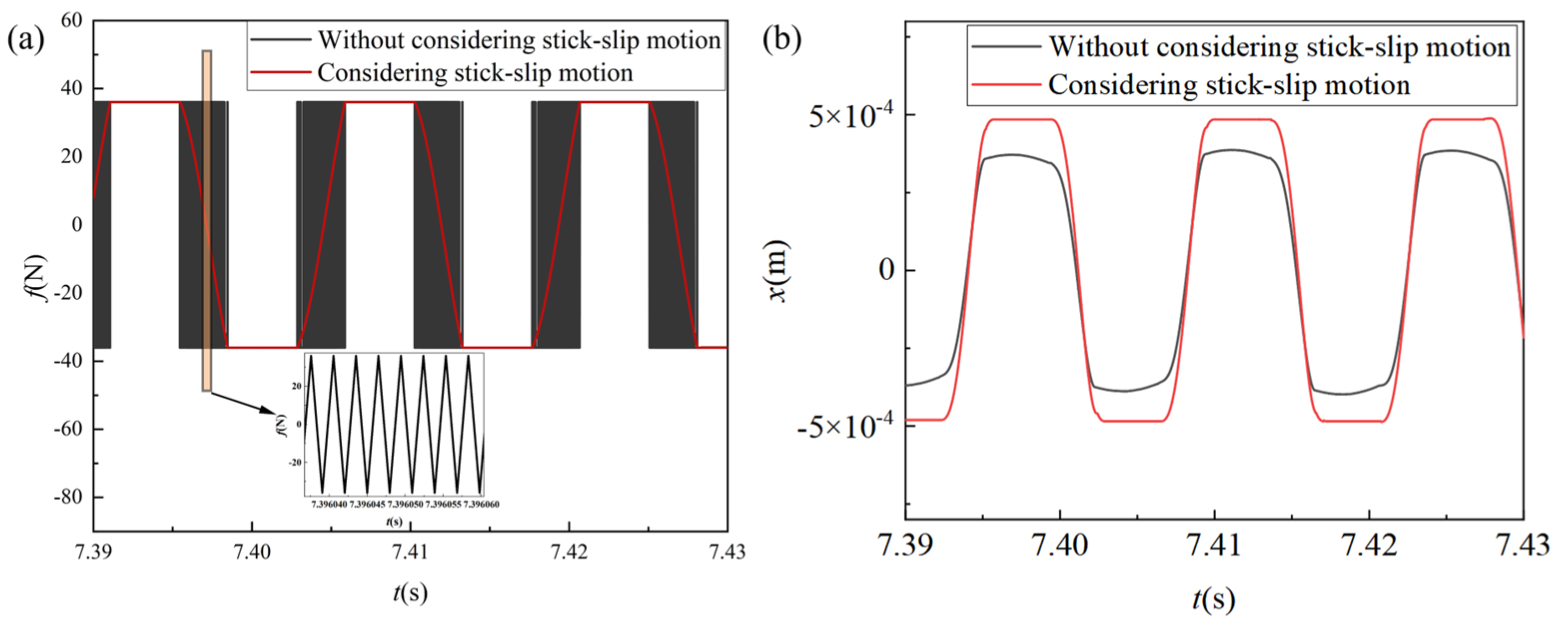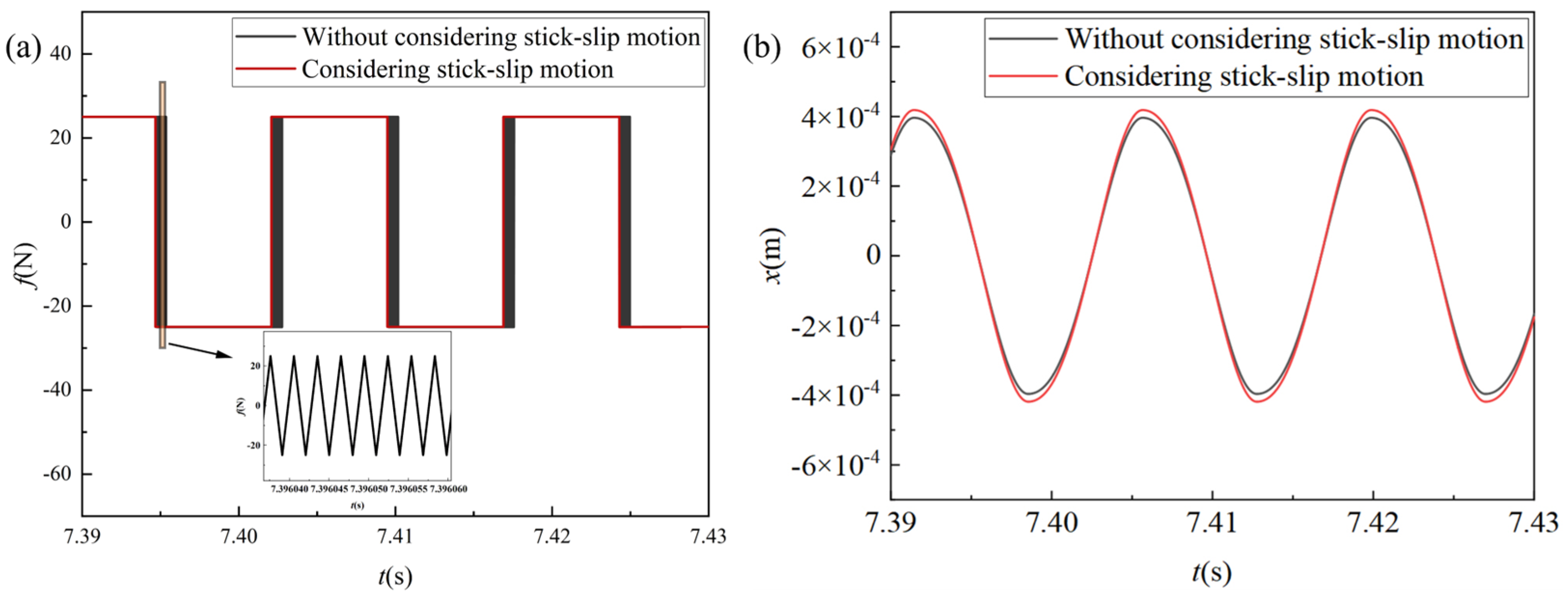 - Compared with considering stick-slip motion, not considering it may cause repeated jumps for the friction force around the zero velocity, which is the main reason for the calculation error, and considering stick-slip motion can enhance the calculation accuracy. The time proportion of the stick state in a steady time cycle mainly determines the deviation of the two types of simulation results.