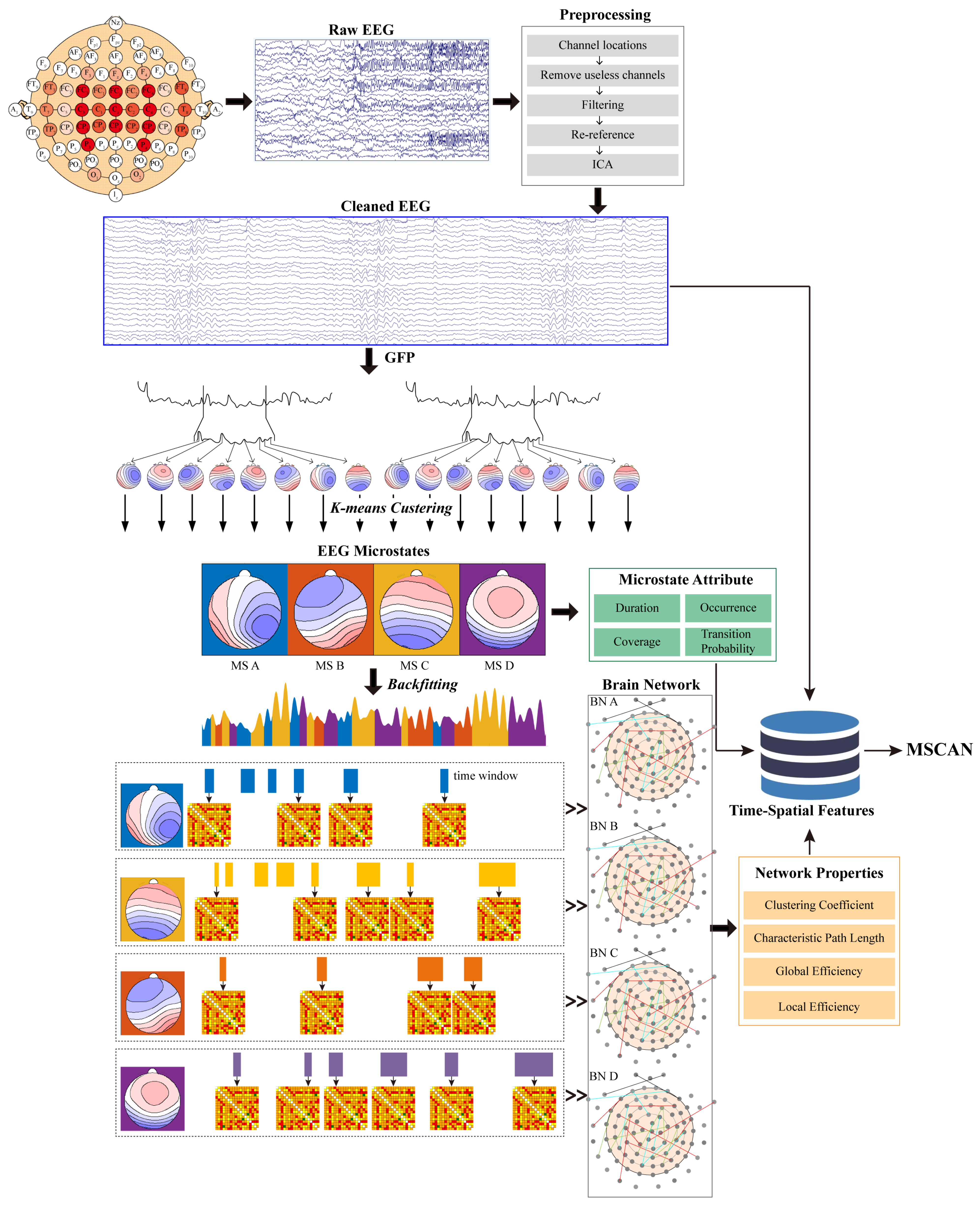 To investigate the role of symmetrical microstate–brain networks in major MDD, we employed a structured analytical pipeline. Resting-state EEG signals were first preprocessed following standard protocols. We then calculated the Global field power (GFP) and extracted its peak time points to obtain EEG topographies with high signal-to-noise ratios. These topographies were clustered into four canonical microstates (A, B, C, D) using the K-means algorithm. Subsequently, the full EEG time series of each participant was segmented by assigning each data point to the best-fitting microstate, resulting in a temporal sequence composed of four distinct microstate classes. Each microstate provides a transient but stable representation of brain activity. We quantified their temporal characteristics using four parameters: duration, occurrence, coverage, and transfer. Unlike conventional brain network analyses that rely on fixed-length time windows, we used the actual duration of each microstate as a dynamic window for network construction. For each microstate type, a corresponding 80 × 80 functional connectivity matrix was computed using PLV values between selected EEG channels, resulting in four microstate-specific networks: BN_A, BN_B, BN_C, and BN_D. Each network was characterized by computing graph-theoretic measures, including the clustering coefficient, characteristic path length, and both local and global efficiency. These features, along with the microstate parameters, were used to capture both linear and nonlinear patterns of brain activity. All extracted features were integrated into our previously developed MSCAN model for MDD classification. This model leverages multiscale information from EEG signals, microstates, and functional connectivity to support intelligent depression diagnosis. An overview of the full methodological pipeline is illustrated in