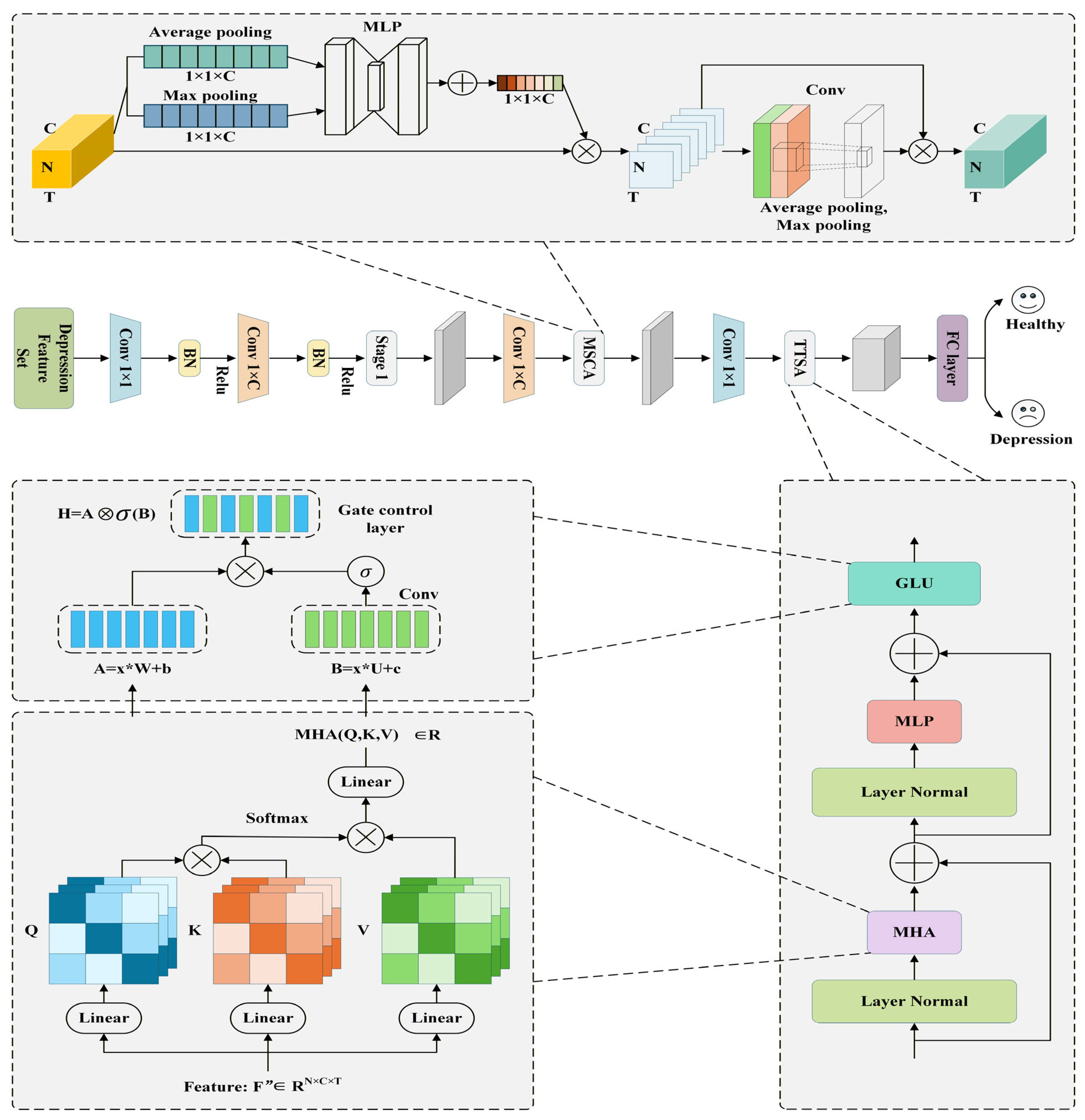 37], to validate the time-frequency characteristics of depression based on microstate-brain network computation. The MSCAN model includes two key modules: the Multiscale Convolutional Attention (MSCA) and temporal end-aware self-attention (TTSA) modules. As shown in