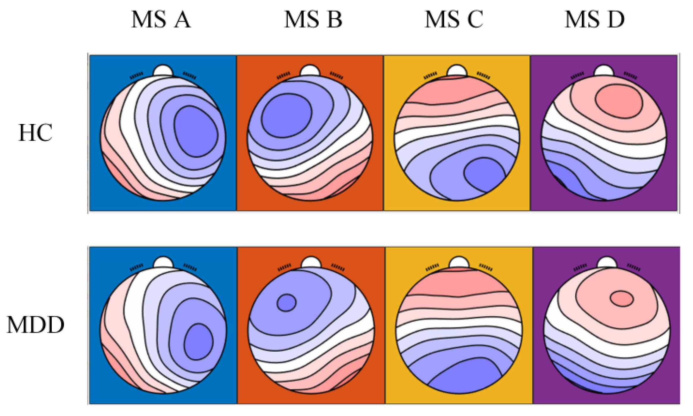 Using K-means clustering, we obtained four types of microstates in the MDD and HC groups. In early studies, topography with a right frontal-to-left posterior configuration was labeled as microstate A [