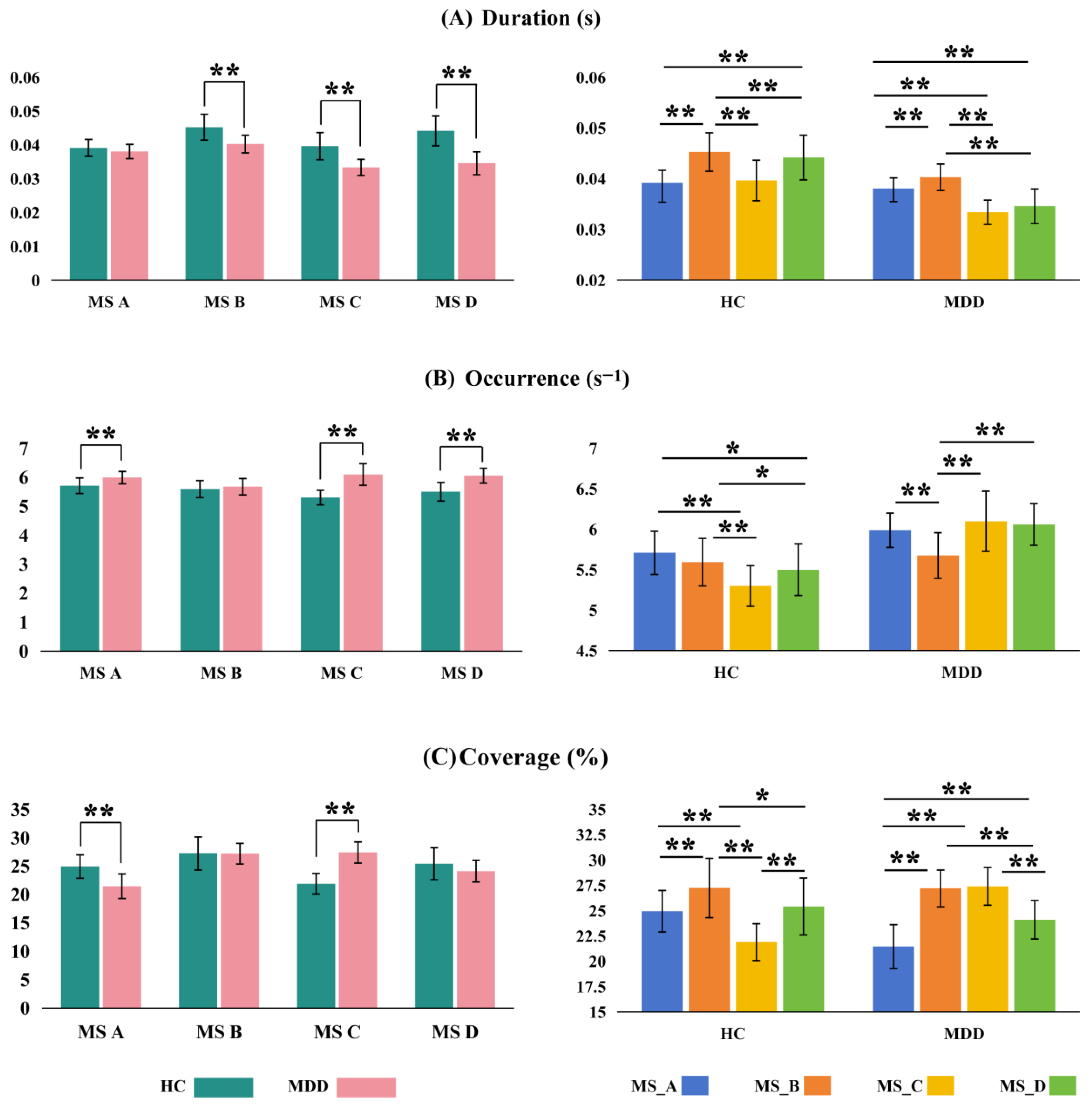 p = 0.088), a downward trend was still evident. In terms of Occurrence, the MDD group showed significantly increased frequencies in MS_A, MS_C, and MS_D, with the most substantial difference in MS_C (t = −9.293,